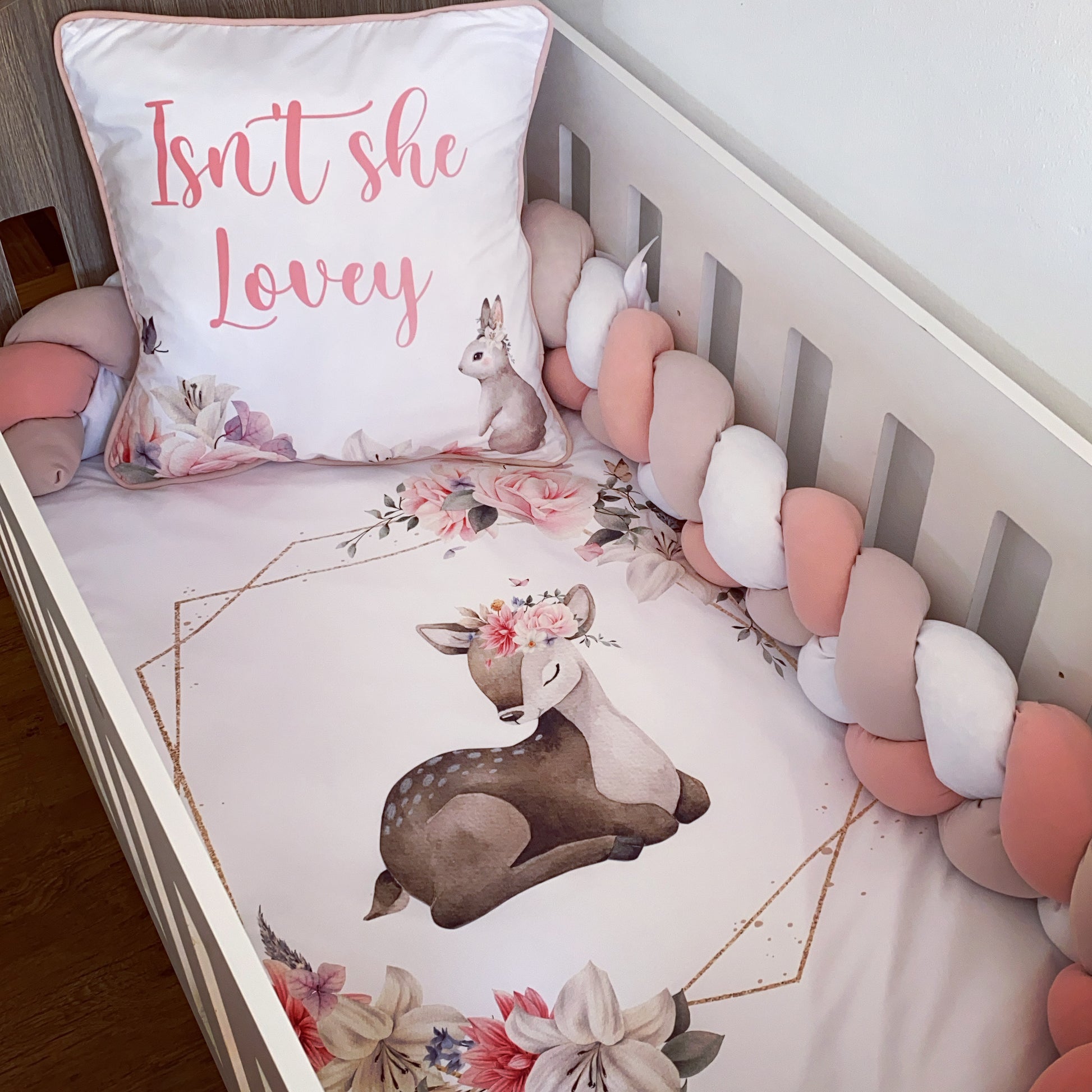 The Nursery Set: Standard Duvet Cover & Inner (80 x 110cm) | 2,5m Braided Bumper | Cot Pillow Cover & Inner | Scatter Cover & Inner | Name Pillow Cover & Inner | Change Mat Cover & Inner | Steel Frame or Wooden Frame | Set of 4 Dangles | White Fitted Sheet