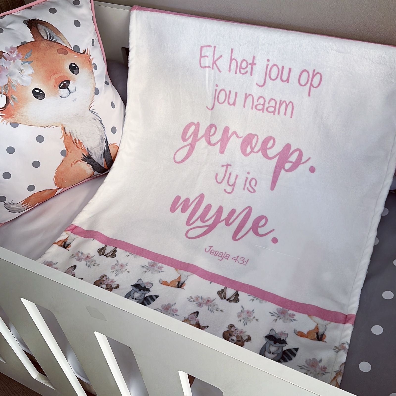 The Nursery Set: Standard Duvet Cover & Inner (80 x 110cm) | 2,5m Braided Bumper | Cot Pillow Cover & Inner | Scatter Cover & Inner | Name Pillow Cover & Inner | Change Mat Cover & Inner | Steel Frame or Wooden Frame | Set of 4 Dangles | White Fitted Sheet
