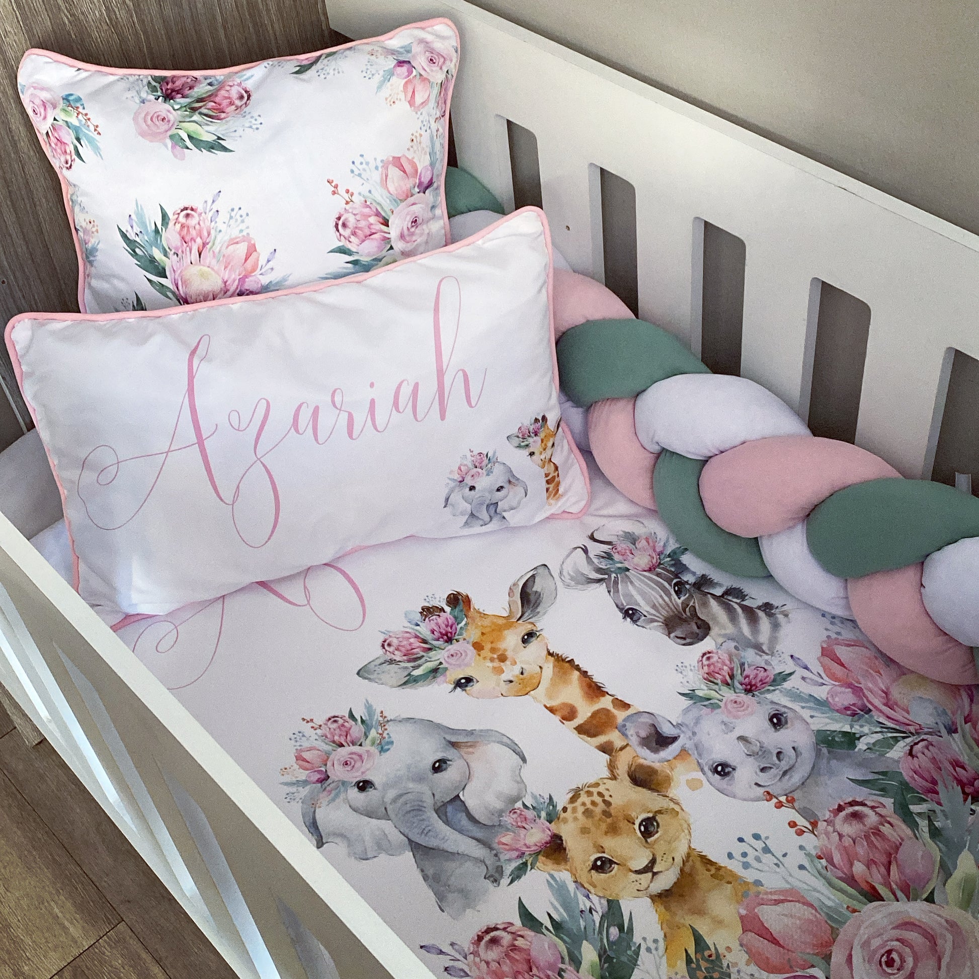 The Nursery Set: Standard Duvet Cover & Inner (80 x 110cm) | 2,5m Braided Bumper | Cot Pillow Cover & Inner | Scatter Cover & Inner | Name Pillow Cover & Inner | Change Mat Cover & Inner | Steel Frame or Wooden Frame | Set of 4 Dangles | White Fitted Sheet