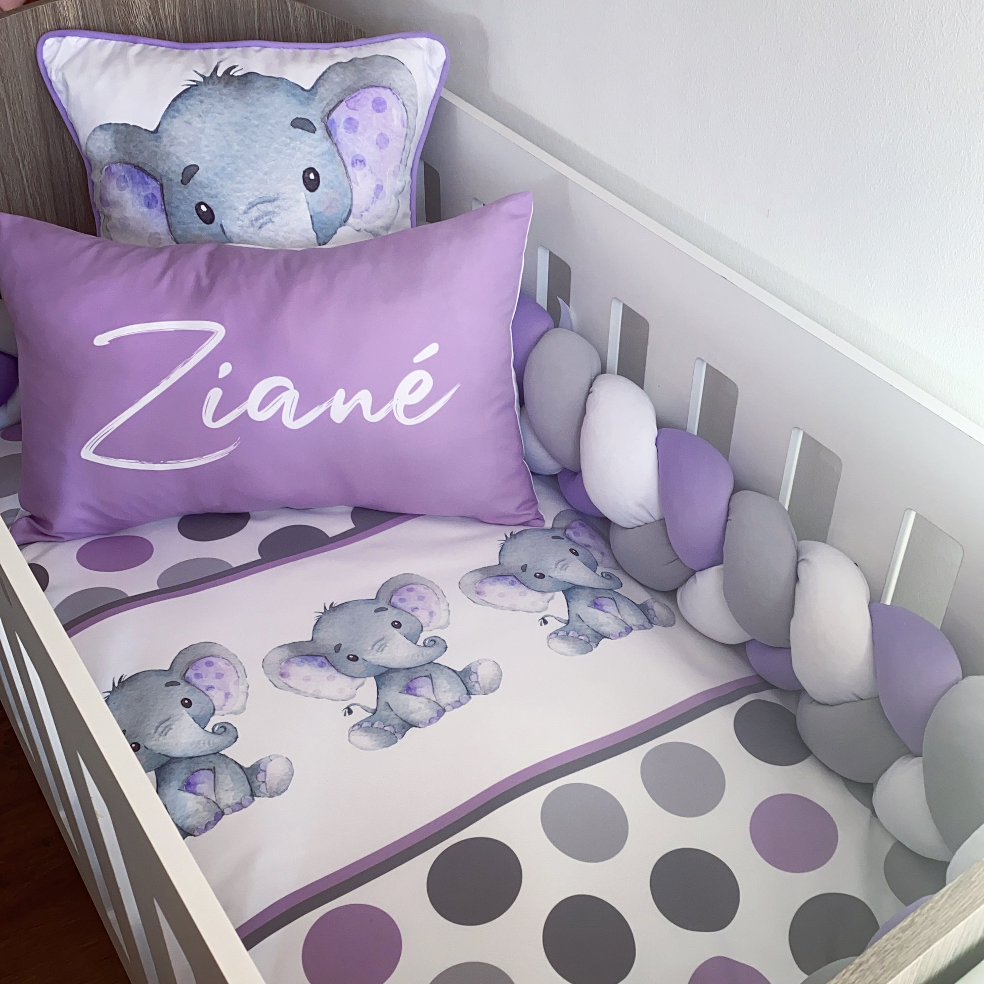 The Nursery Set: Standard Duvet Cover & Inner (80 x 110cm) | 2,5m Braided Bumper | Cot Pillow Cover & Inner | Scatter Cover & Inner | Name Pillow Cover & Inner | Change Mat Cover & Inner | Steel Frame or Wooden Frame | Set of 4 Dangles | White Fitted Sheet