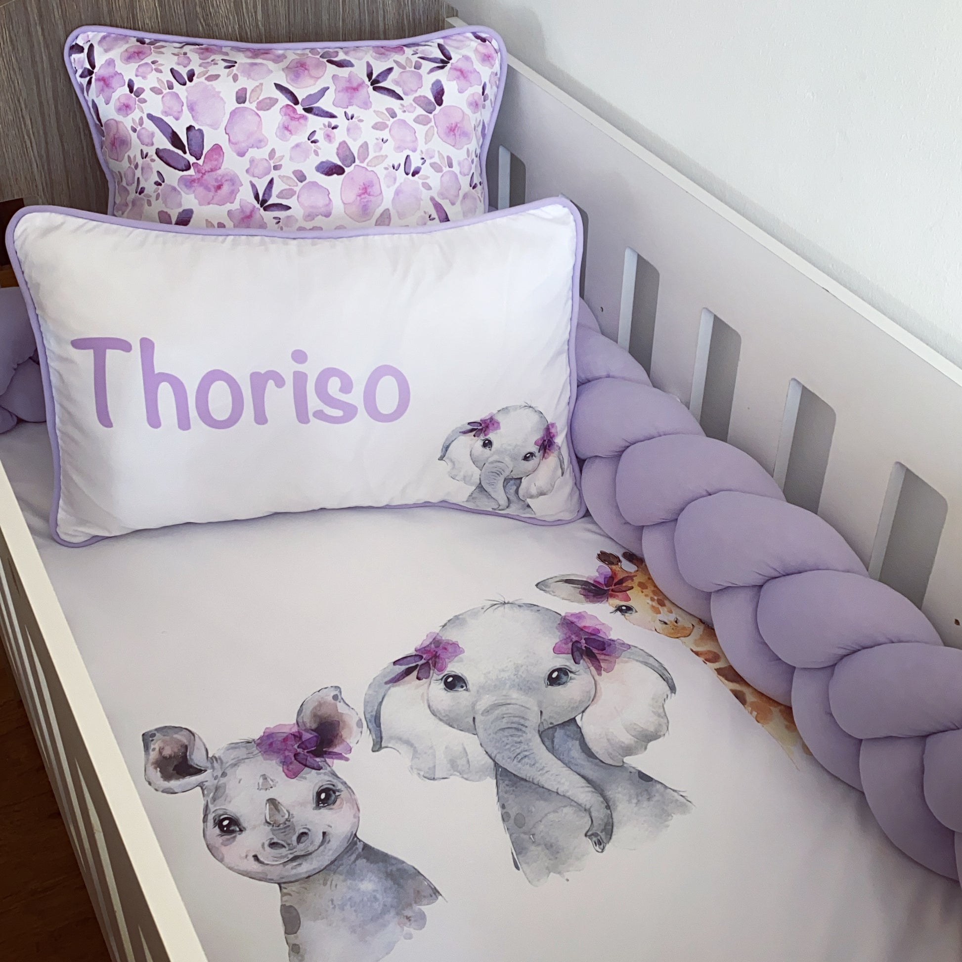 The Nursery Set: Standard Duvet Cover & Inner (80 x 110cm) | 2,5m Braided Bumper | Cot Pillow Cover & Inner | Scatter Cover & Inner | Name Pillow Cover & Inner | Change Mat Cover & Inner | Steel Frame or Wooden Frame | Set of 4 Dangles | White Fitted Sheet