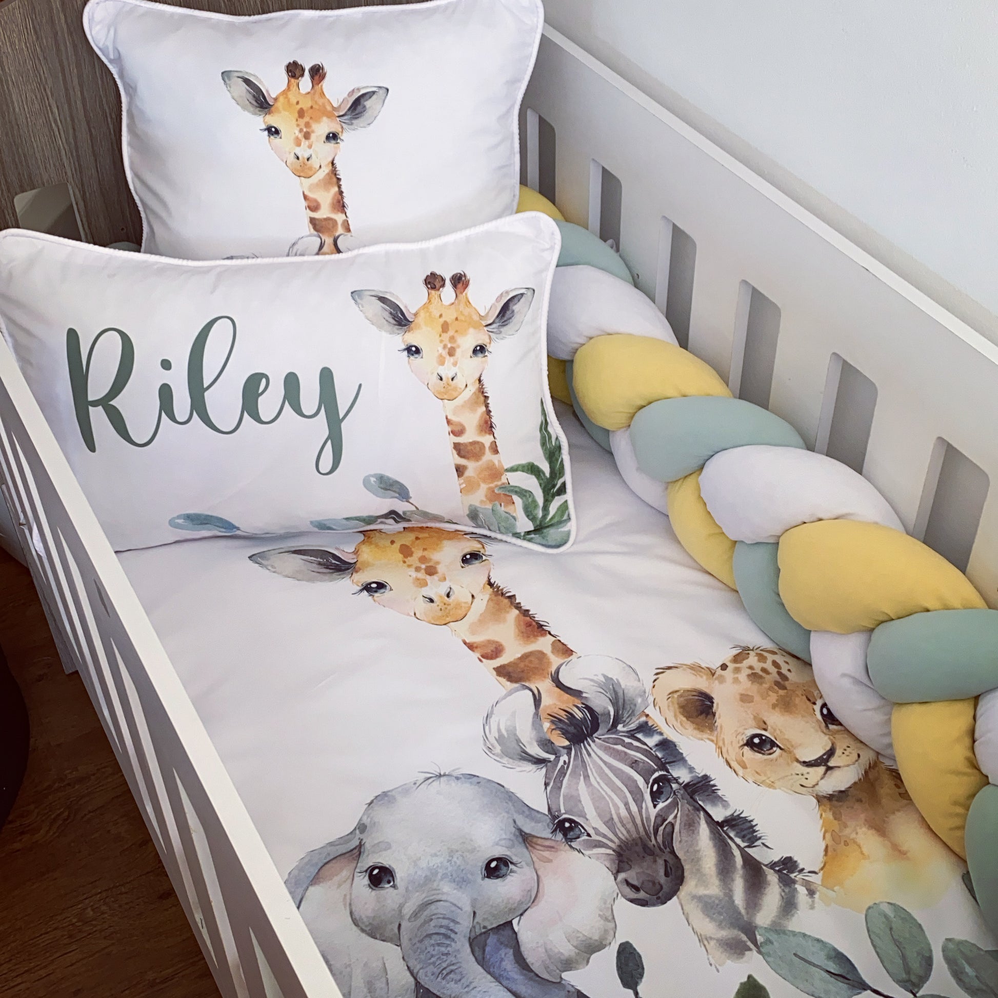 The Nursery Set: Standard Duvet Cover & Inner (80 x 110cm) | 2,5m Braided Bumper | Cot Pillow Cover & Inner | Scatter Cover & Inner | Name Pillow Cover & Inner | Change Mat Cover & Inner | Steel Frame or Wooden Frame | Set of 4 Dangles | White Fitted Sheet