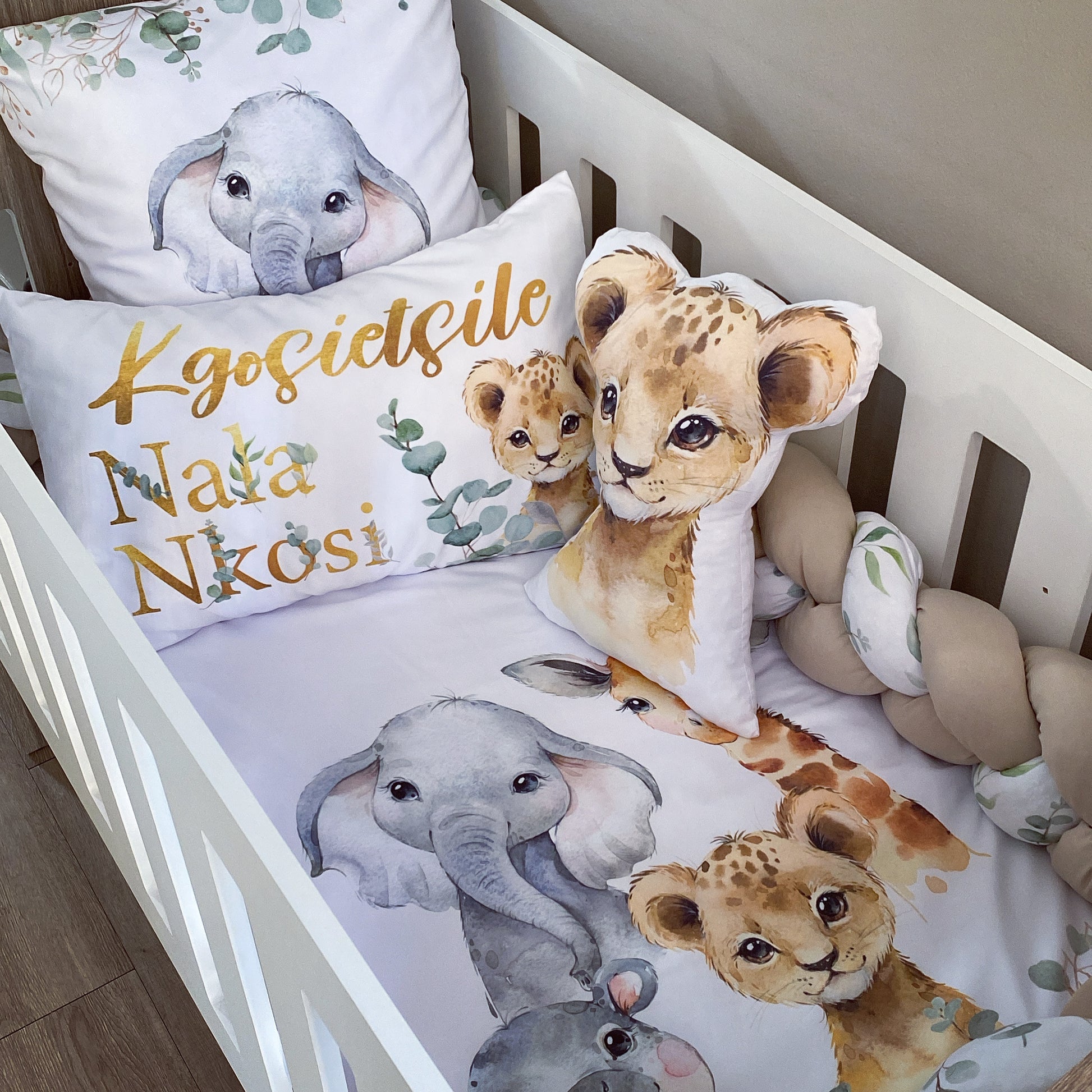 The Nursery Set: Standard Duvet Cover & Inner (80 x 110cm) | 2,5m Braided Bumper | Cot Pillow Cover & Inner | Scatter Cover & Inner | Name Pillow Cover & Inner | Change Mat Cover & Inner | Steel Frame or Wooden Frame | Set of 4 Dangles | White Fitted Sheet