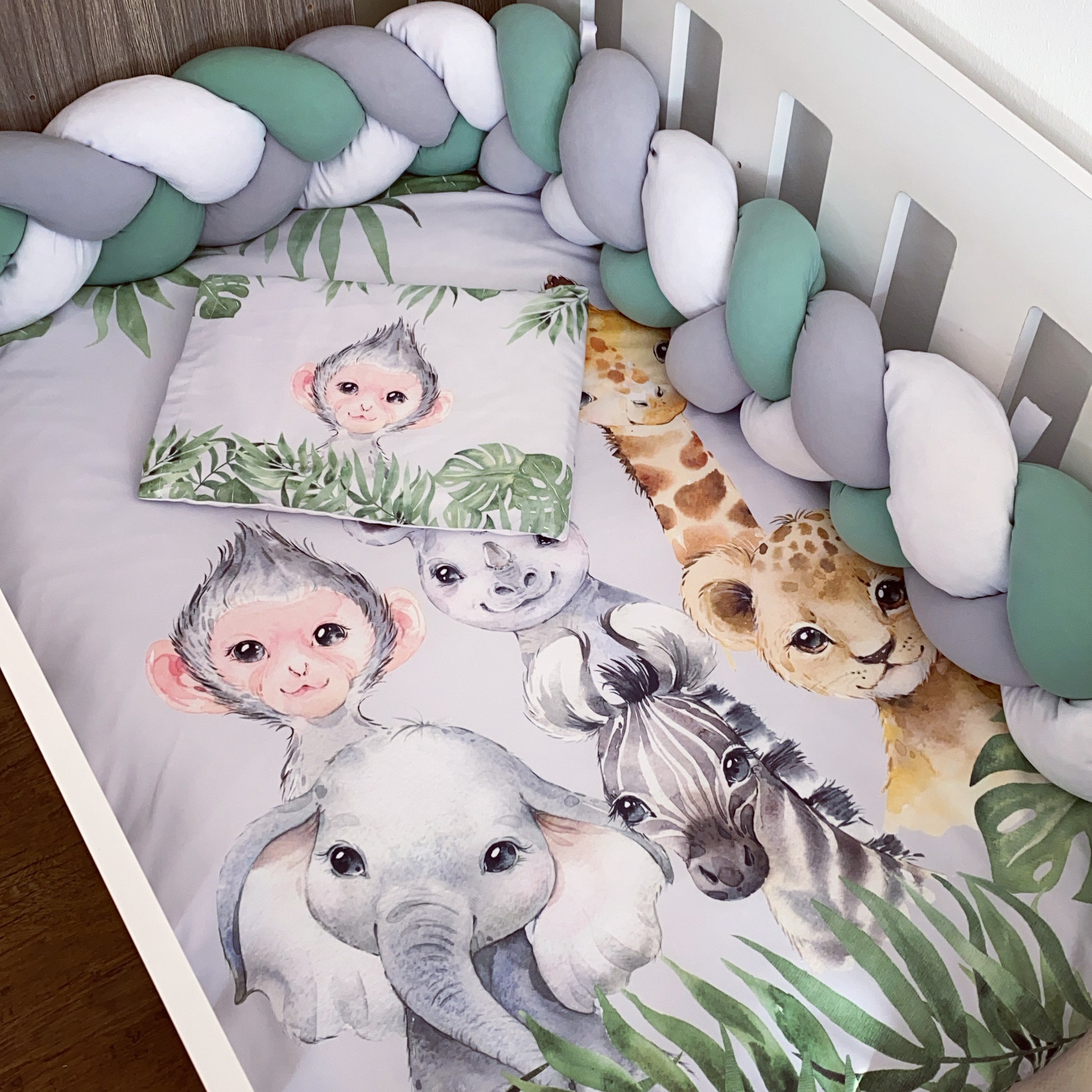 The Nursery Set: Standard Duvet Cover & Inner (80 x 110cm) | 2,5m Braided Bumper | Cot Pillow Cover & Inner | Scatter Cover & Inner | Name Pillow Cover & Inner | Change Mat Cover & Inner | Steel Frame or Wooden Frame | Set of 4 Dangles | White Fitted Sheet