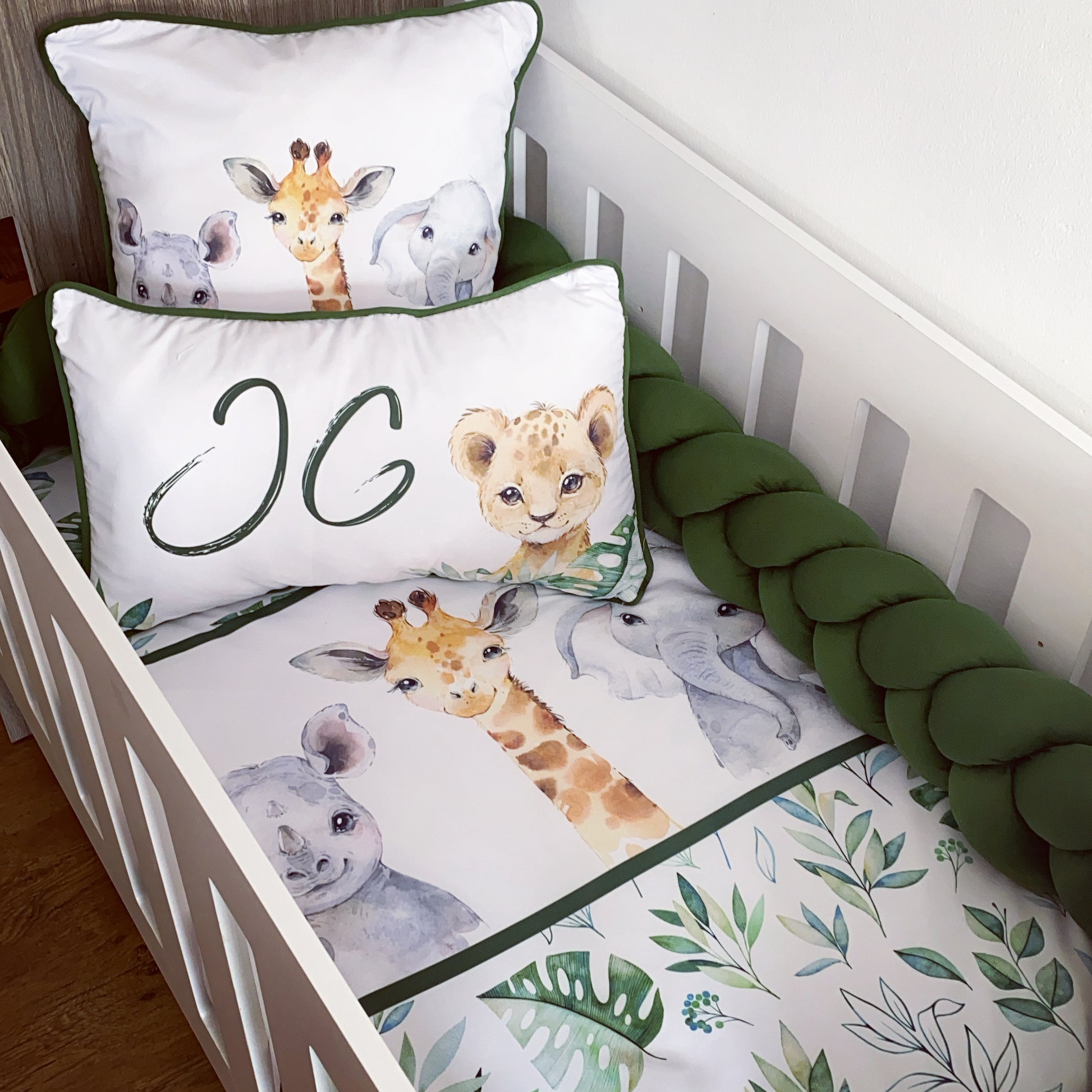 The Nursery Set: Standard Duvet Cover & Inner (80 x 110cm) | 2,5m Braided Bumper | Cot Pillow Cover & Inner | Scatter Cover & Inner | Name Pillow Cover & Inner | Change Mat Cover & Inner | Steel Frame or Wooden Frame | Set of 4 Dangles | White Fitted Sheet