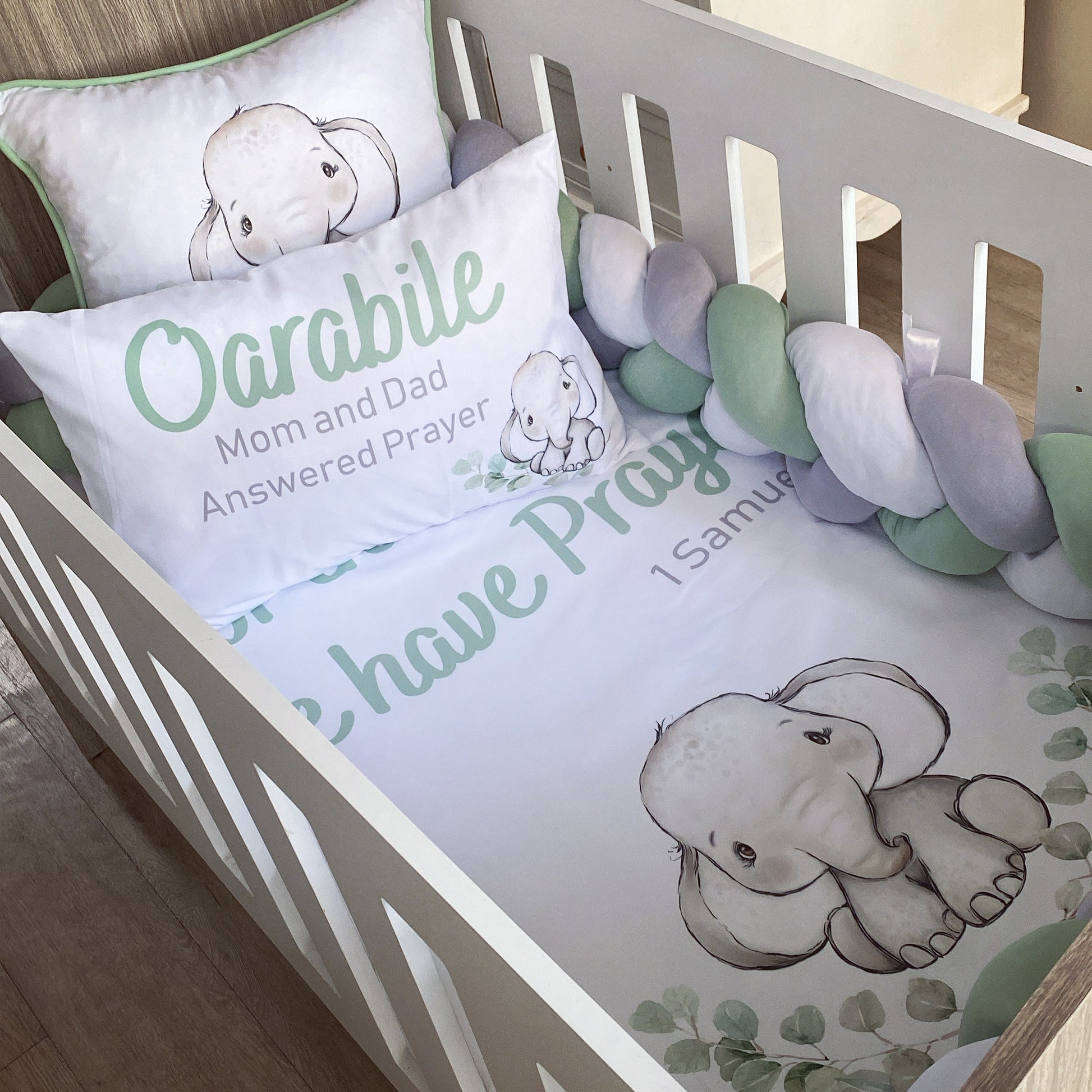 The Nursery Set: Standard Duvet Cover & Inner (80 x 110cm) | 2,5m Braided Bumper | Cot Pillow Cover & Inner | Scatter Cover & Inner | Name Pillow Cover & Inner | Change Mat Cover & Inner | Steel Frame or Wooden Frame | Set of 4 Dangles | White Fitted Sheet