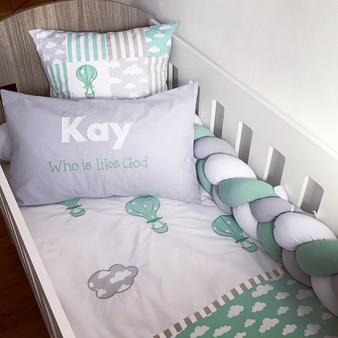 The Nursery Set: Standard Duvet Cover & Inner (80 x 110cm) | 2,5m Braided Bumper | Cot Pillow Cover & Inner | Scatter Cover & Inner | Name Pillow Cover & Inner | Change Mat Cover & Inner | Steel Frame or Wooden Frame | Set of 4 Dangles | White Fitted Sheet