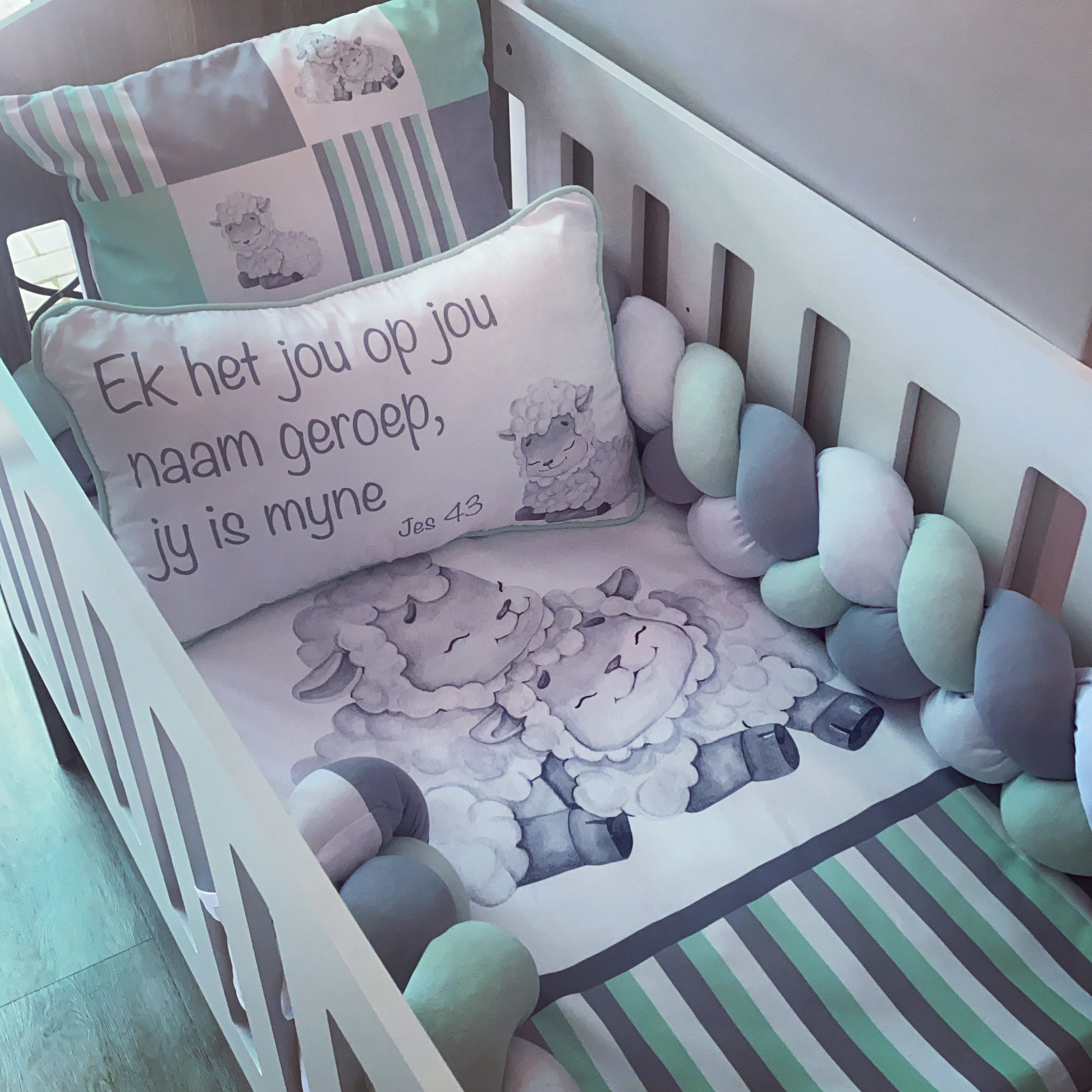 The Nursery Set: Standard Duvet Cover & Inner (80 x 110cm) | 2,5m Braided Bumper | Cot Pillow Cover & Inner | Scatter Cover & Inner | Name Pillow Cover & Inner | Change Mat Cover & Inner | Steel Frame or Wooden Frame | Set of 4 Dangles | White Fitted Sheet