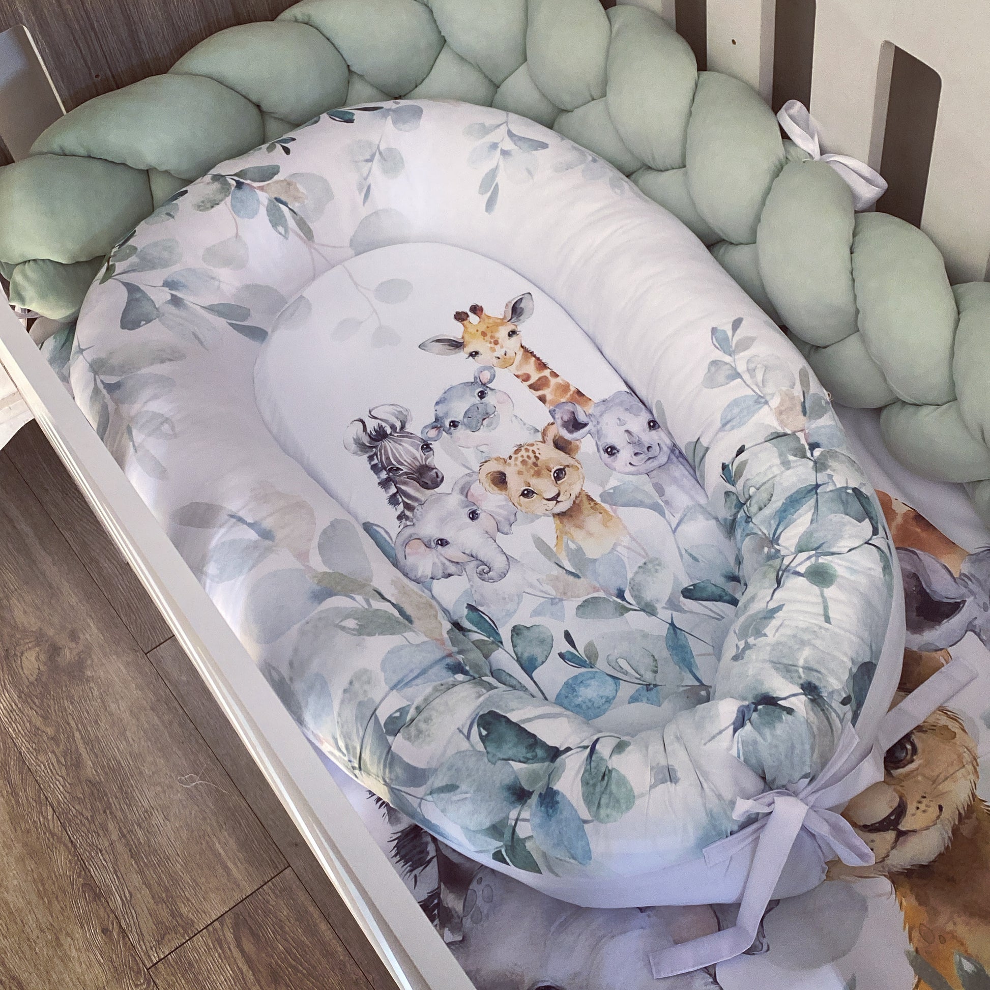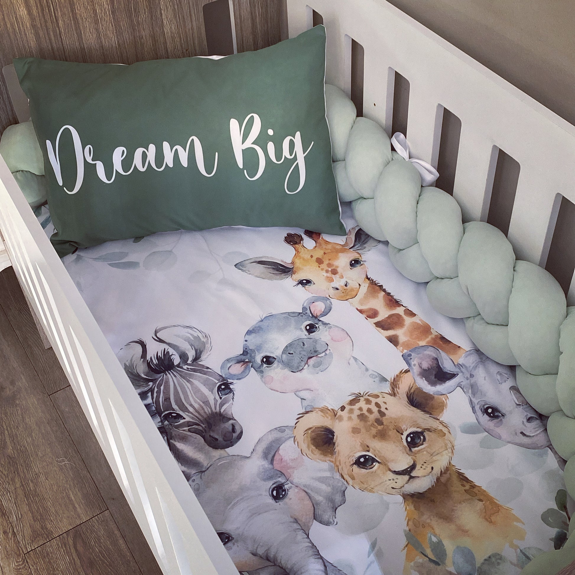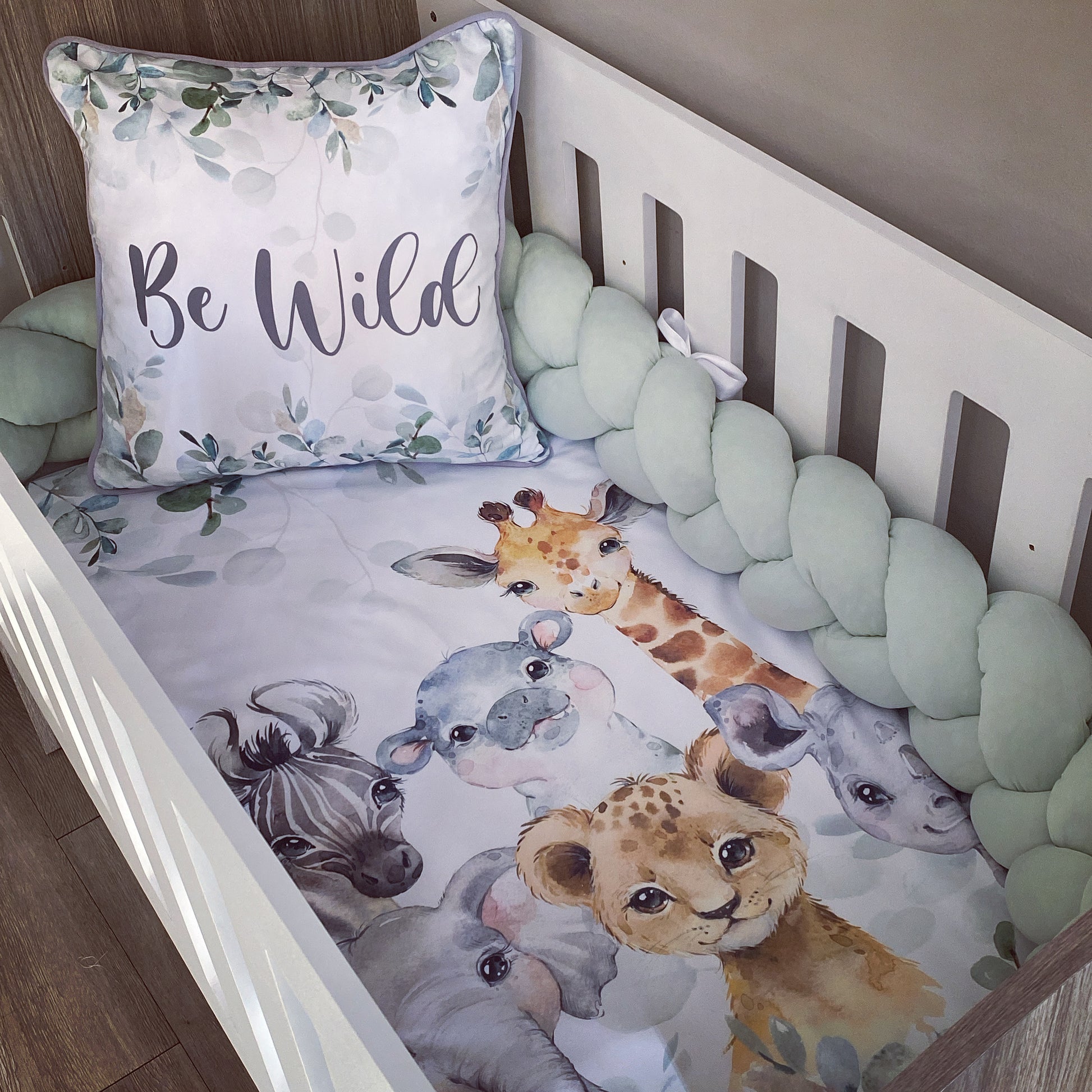 The Nursery Set: Standard Duvet Cover & Inner (80 x 110cm) | 2,5m Braided Bumper | Cot Pillow Cover & Inner | Scatter Cover & Inner | Name Pillow Cover & Inner | Change Mat Cover & Inner | Steel Frame or Wooden Frame | Set of 4 Dangles | White Fitted Sheet