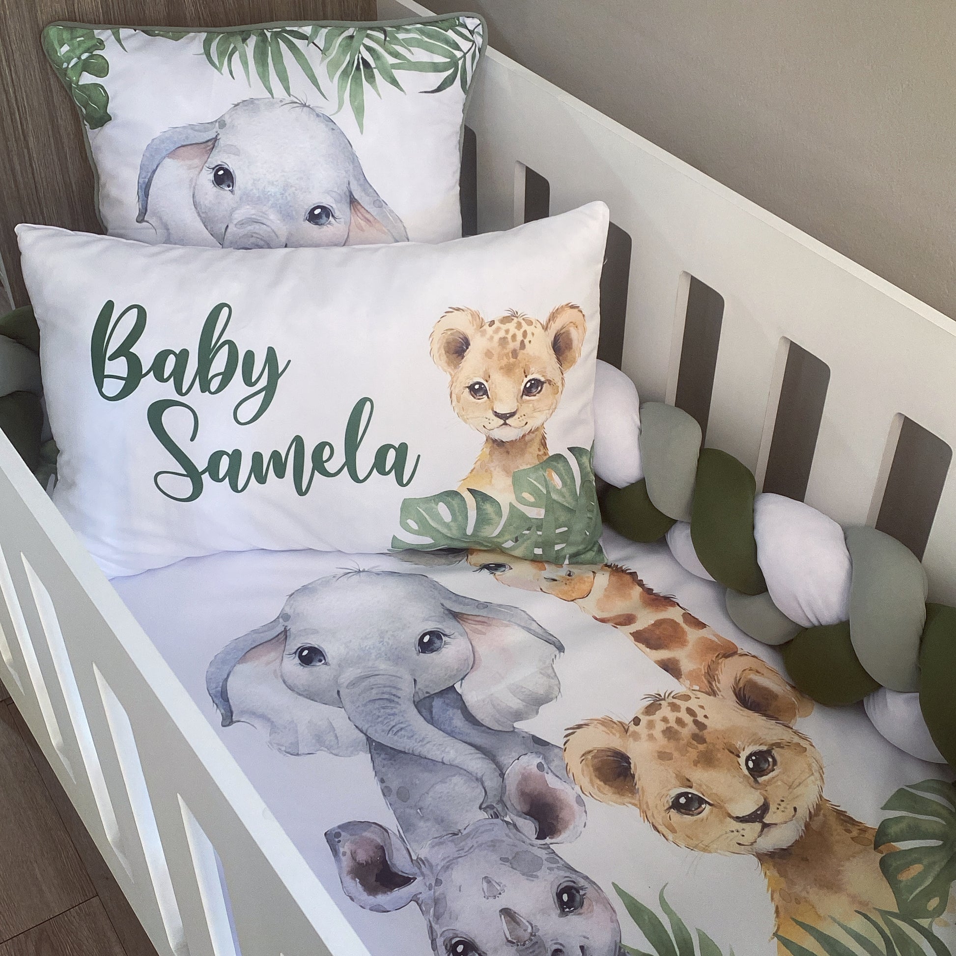 The Nursery Set: Standard Duvet Cover & Inner (80 x 110cm) | 2,5m Braided Bumper | Cot Pillow Cover & Inner | Scatter Cover & Inner | Name Pillow Cover & Inner | Change Mat Cover & Inner | Steel Frame or Wooden Frame | Set of 4 Dangles | White Fitted Sheet