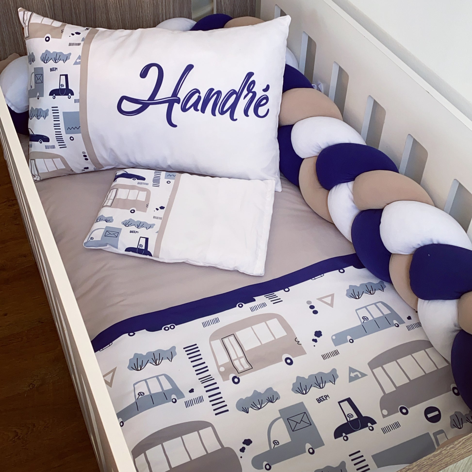 The Standard Set: Standard Duvet Cover & Inner (80 x 110cm) | 2,5m Braided Bumper | Cot Pillow Cover & Inner | Scatter Cover & Inner | Name Pillow Cover & Inner | White Fitted Sheet