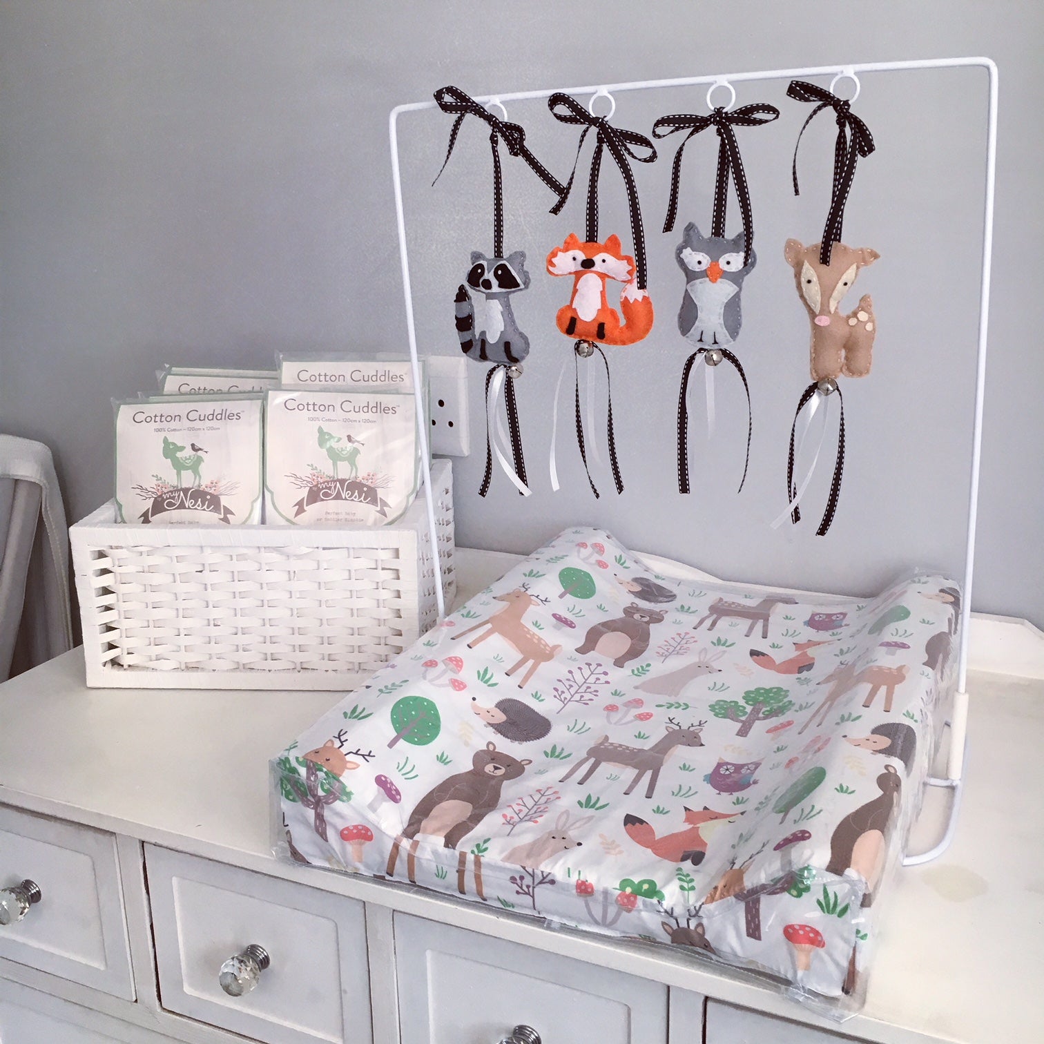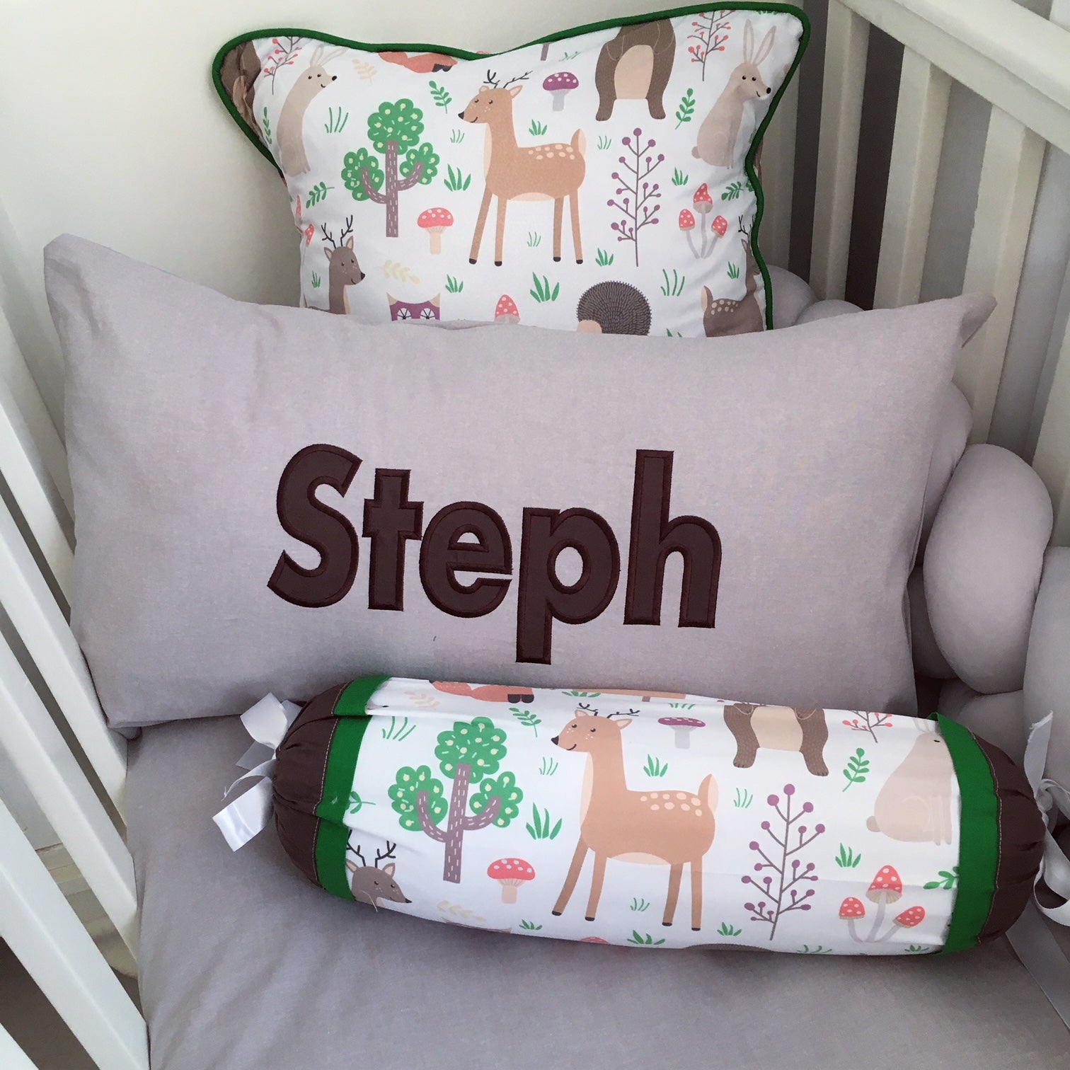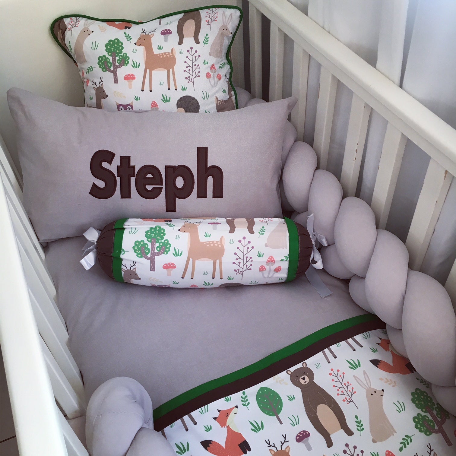 The Nursery Set: Standard Duvet Cover & Inner (80 x 110cm) | 2,5m Braided Bumper | Cot Pillow Cover & Inner | Scatter Cover & Inner | Name Pillow Cover & Inner | Change Mat Cover & Inner | Steel Frame or Wooden Frame | Set of 4 Dangles | White Fitted Sheet