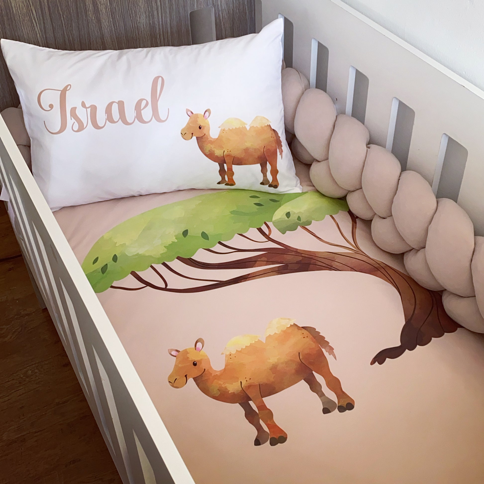 The Nursery Set: Standard Duvet Cover & Inner (80 x 110cm) | 2,5m Braided Bumper | Cot Pillow Cover & Inner | Scatter Cover & Inner | Name Pillow Cover & Inner | Change Mat Cover & Inner | Steel Frame or Wooden Frame | Set of 4 Dangles | White Fitted Sheet