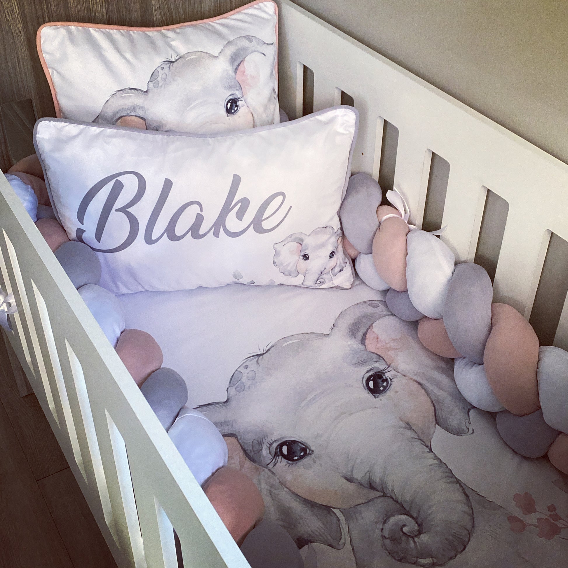 The Nursery Set: Standard Duvet Cover & Inner (80 x 110cm) | 2,5m Braided Bumper | Cot Pillow Cover & Inner | Scatter Cover & Inner | Name Pillow Cover & Inner | Change Mat Cover & Inner | Steel Frame or Wooden Frame | Set of 4 Dangles | White Fitted Sheet