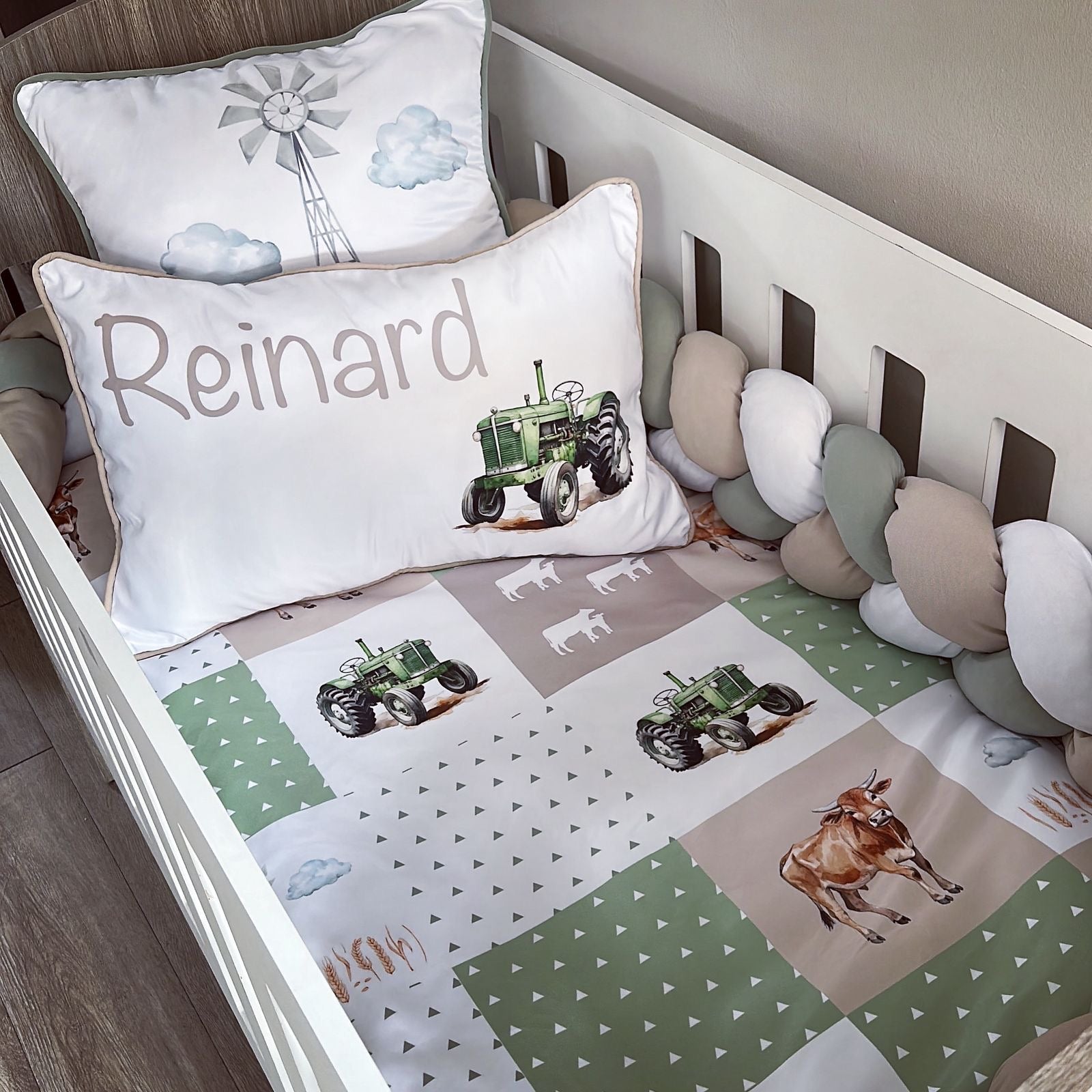 The Nursery Set: Standard Duvet Cover & Inner (80 x 110cm) | 2,5m Braided Bumper | Cot Pillow Cover & Inner | Scatter Cover & Inner | Name Pillow Cover & Inner | Change Mat Cover & Inner | Steel Frame or Wooden Frame | Set of 4 Dangles | White Fitted Sheet