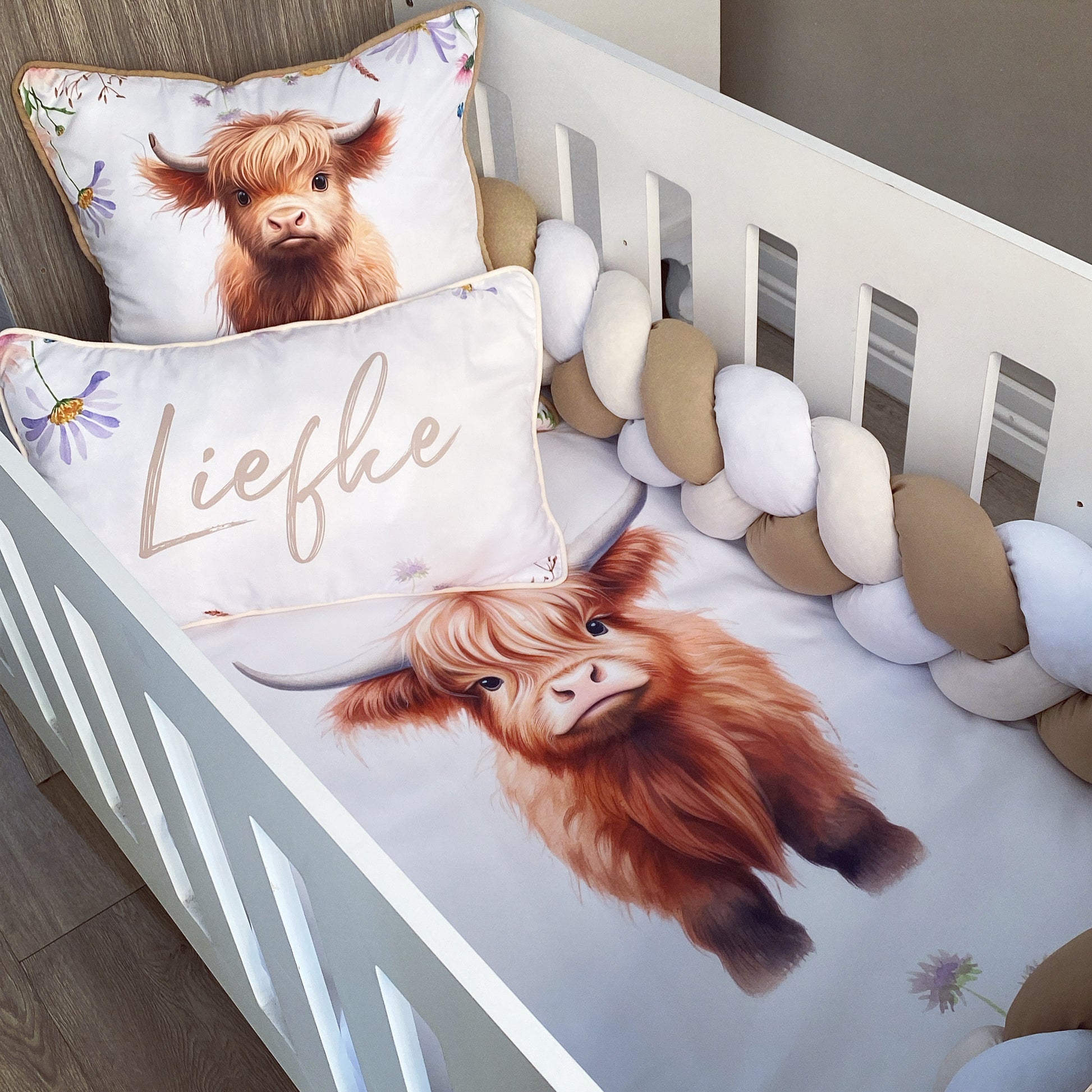 The Standard Set: Standard Duvet Cover & Inner (80 x 110cm) | 2,5m Braided Bumper | Cot Pillow Cover & Inner | Scatter Cover & Inner | Name Pillow Cover & Inner | White Fitted Sheet