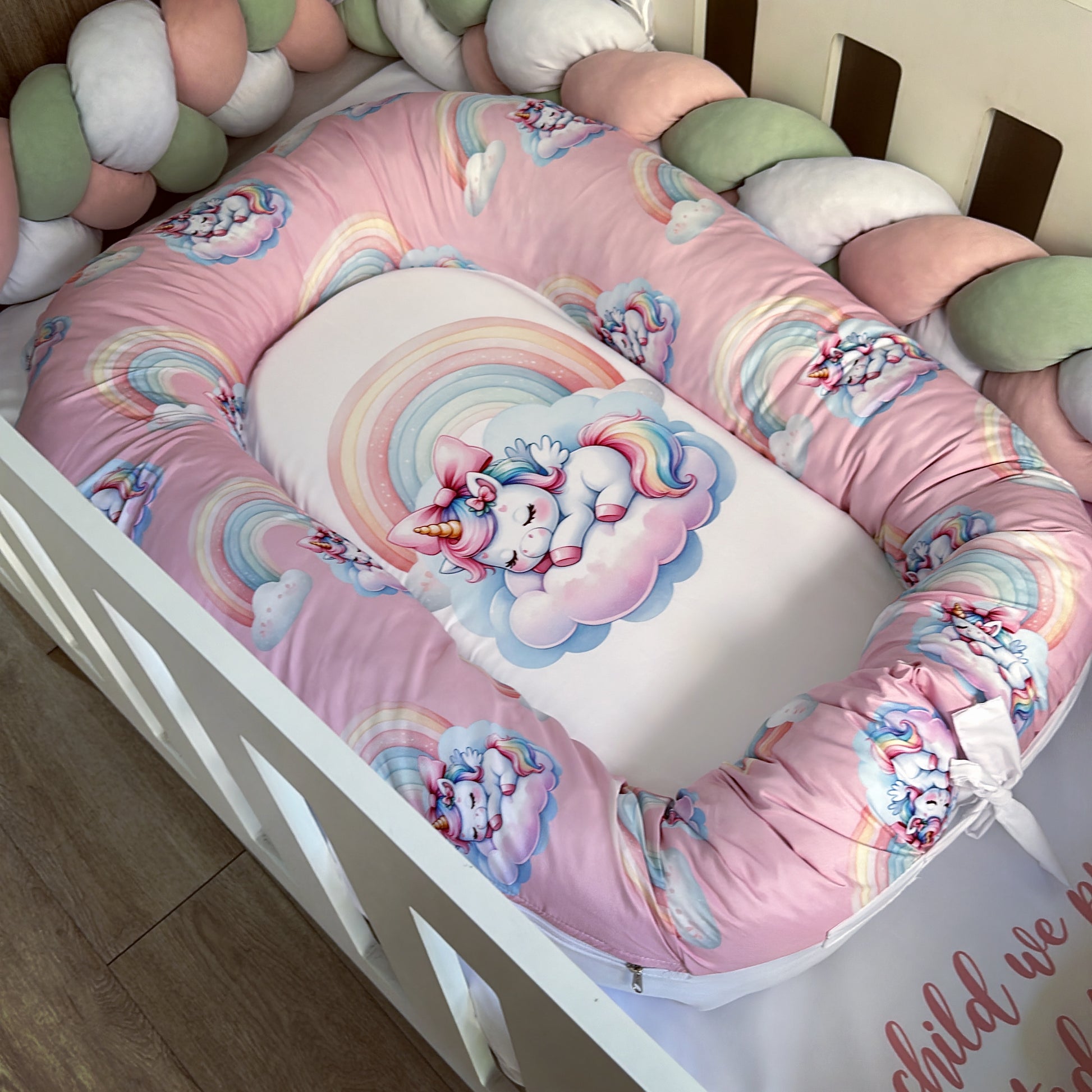 The Nursery Set: Standard Duvet Cover & Inner (80 x 110cm) | 2,5m Braided Bumper | Cot Pillow Cover & Inner | Scatter Cover & Inner | Name Pillow Cover & Inner | Change Mat Cover & Inner | Steel Frame or Wooden Frame | Set of 4 Dangles | White Fitted Sheet
