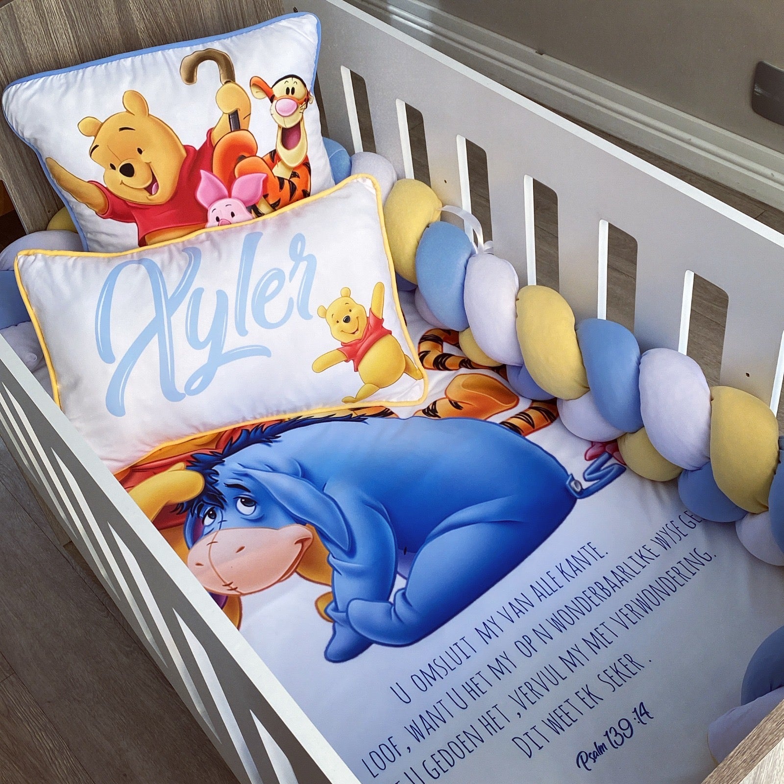 The Nursery Set: Standard Duvet Cover & Inner (80 x 110cm) | 2,5m Braided Bumper | Cot Pillow Cover & Inner | Scatter Cover & Inner | Name Pillow Cover & Inner | Change Mat Cover & Inner | Steel Frame or Wooden Frame | Set of 4 Dangles | White Fitted Sheet