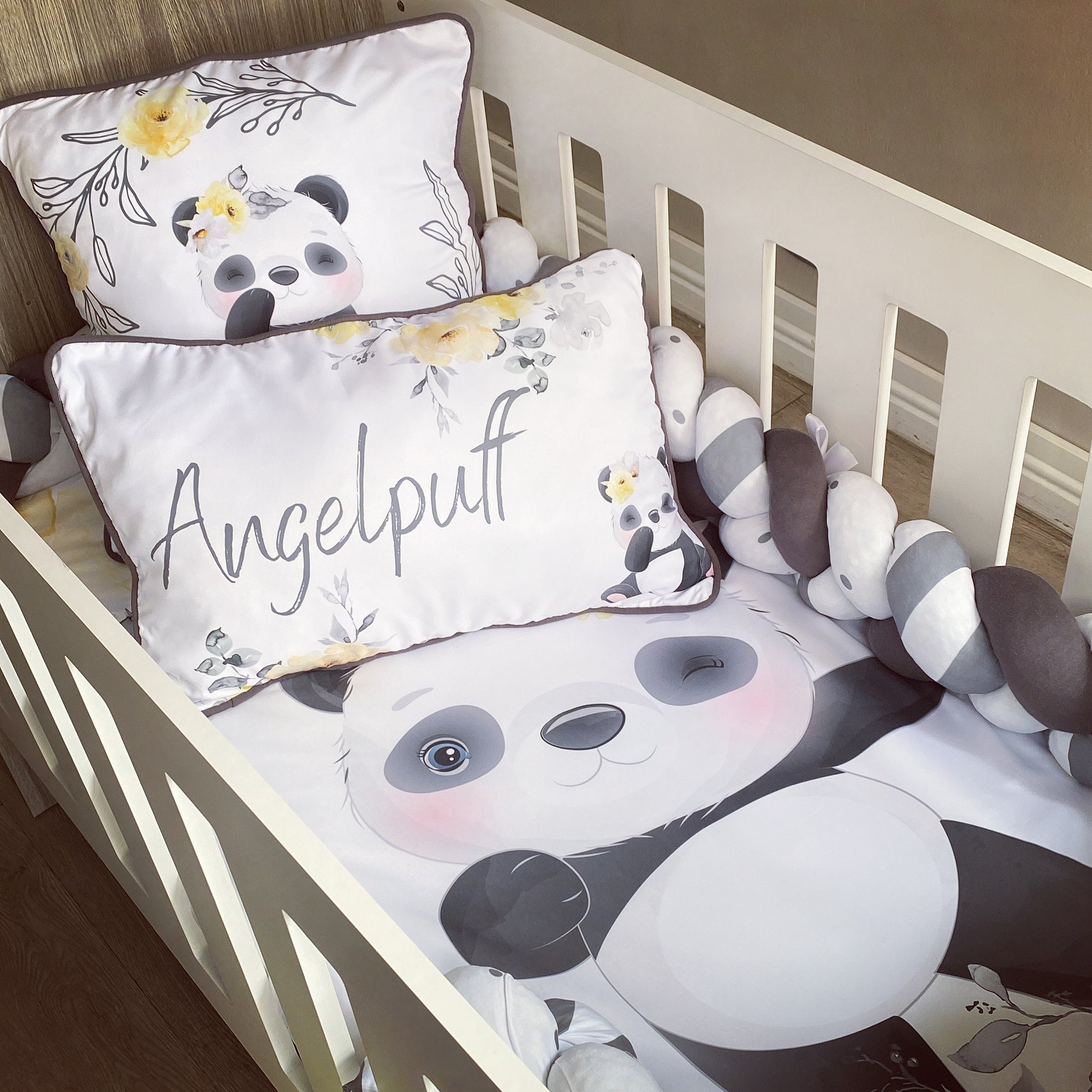 The Nursery Set: Standard Duvet Cover & Inner (80 x 110cm) | 2,5m Braided Bumper | Cot Pillow Cover & Inner | Scatter Cover & Inner | Name Pillow Cover & Inner | Change Mat Cover & Inner | Steel Frame or Wooden Frame | Set of 4 Dangles | White Fitted Sheet