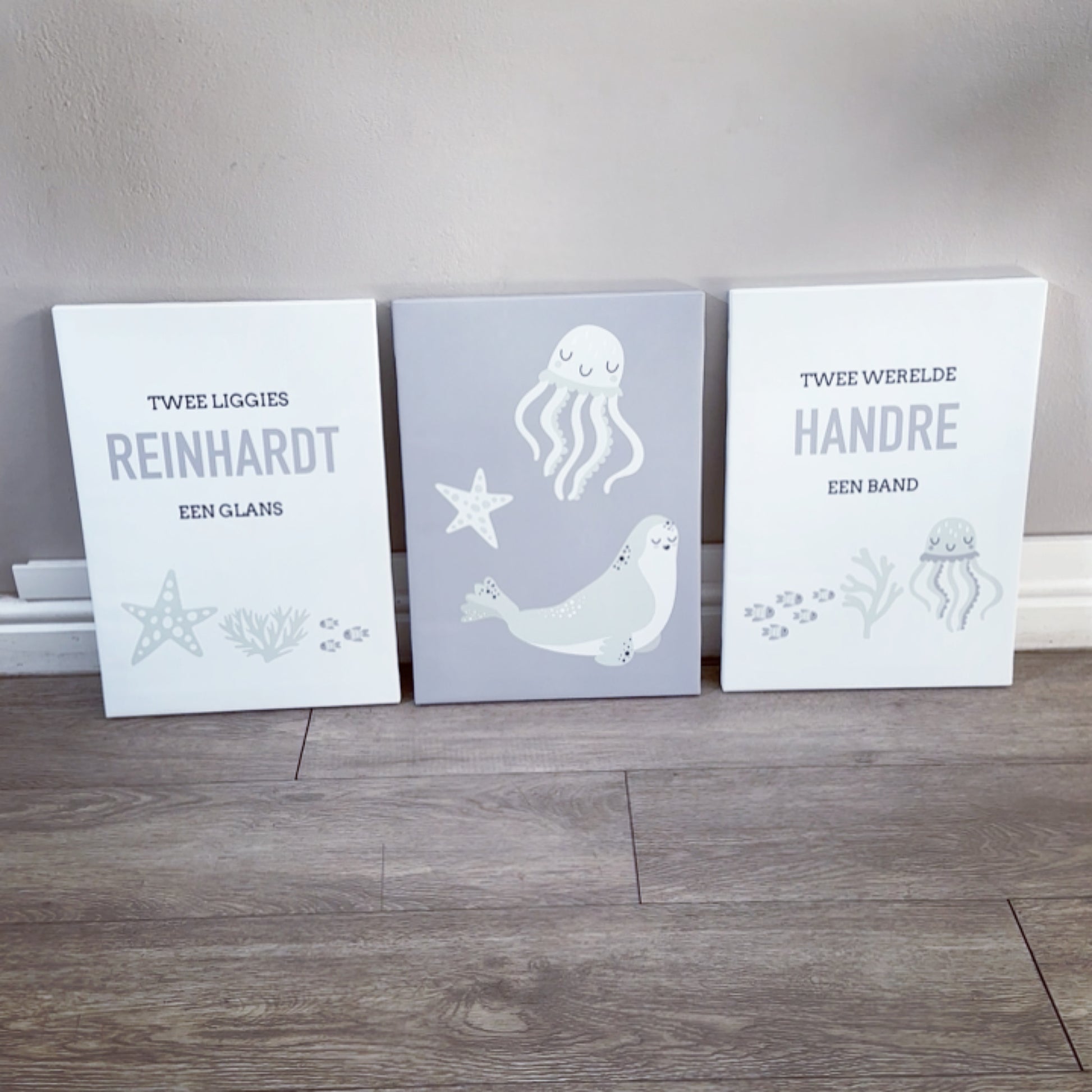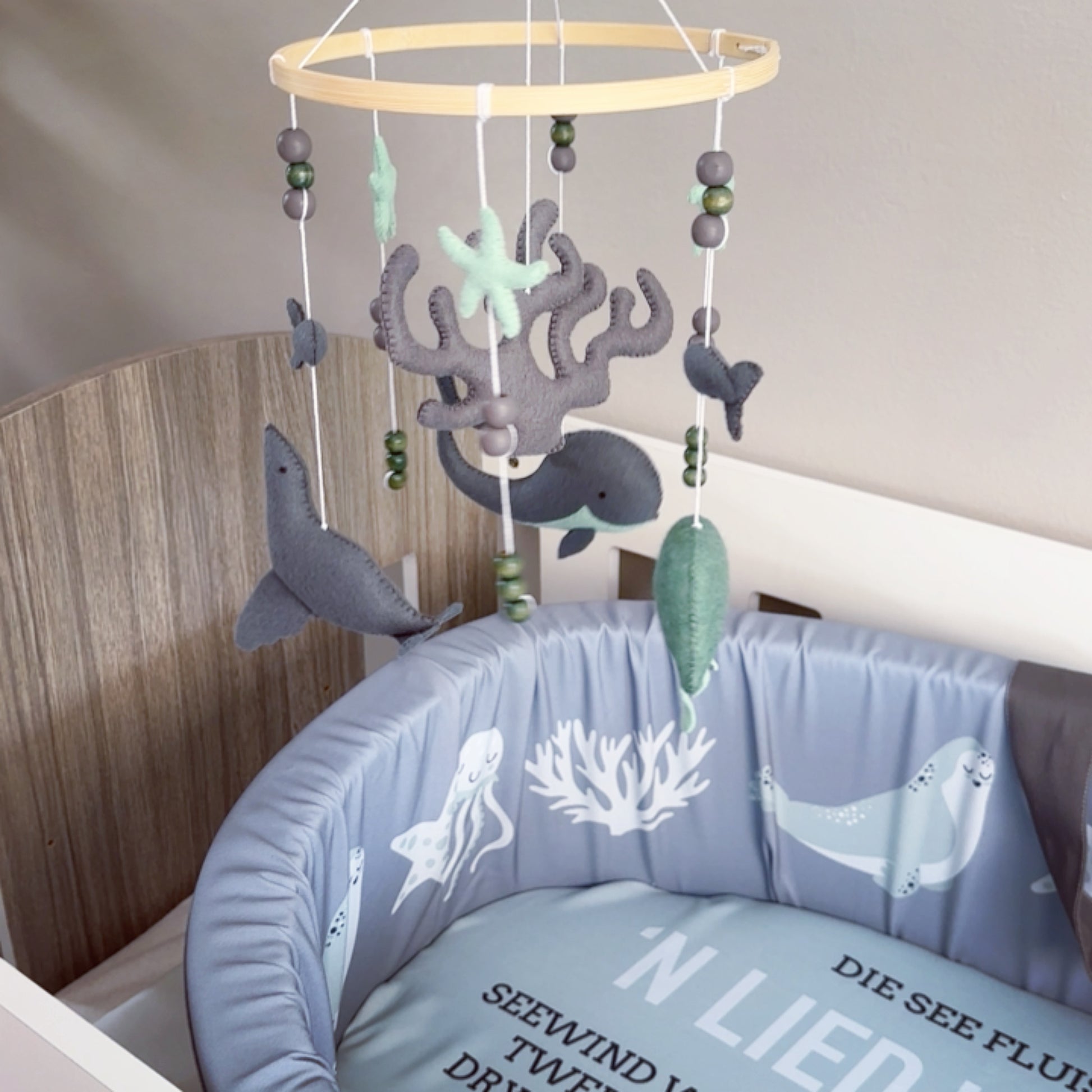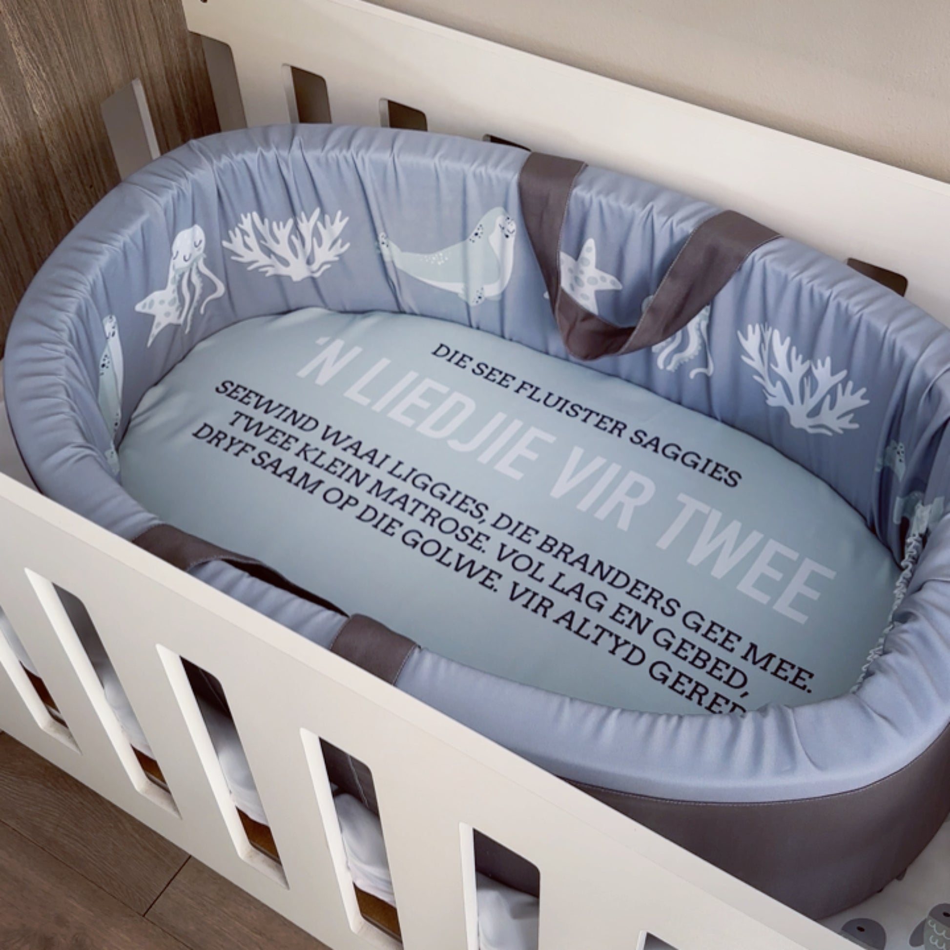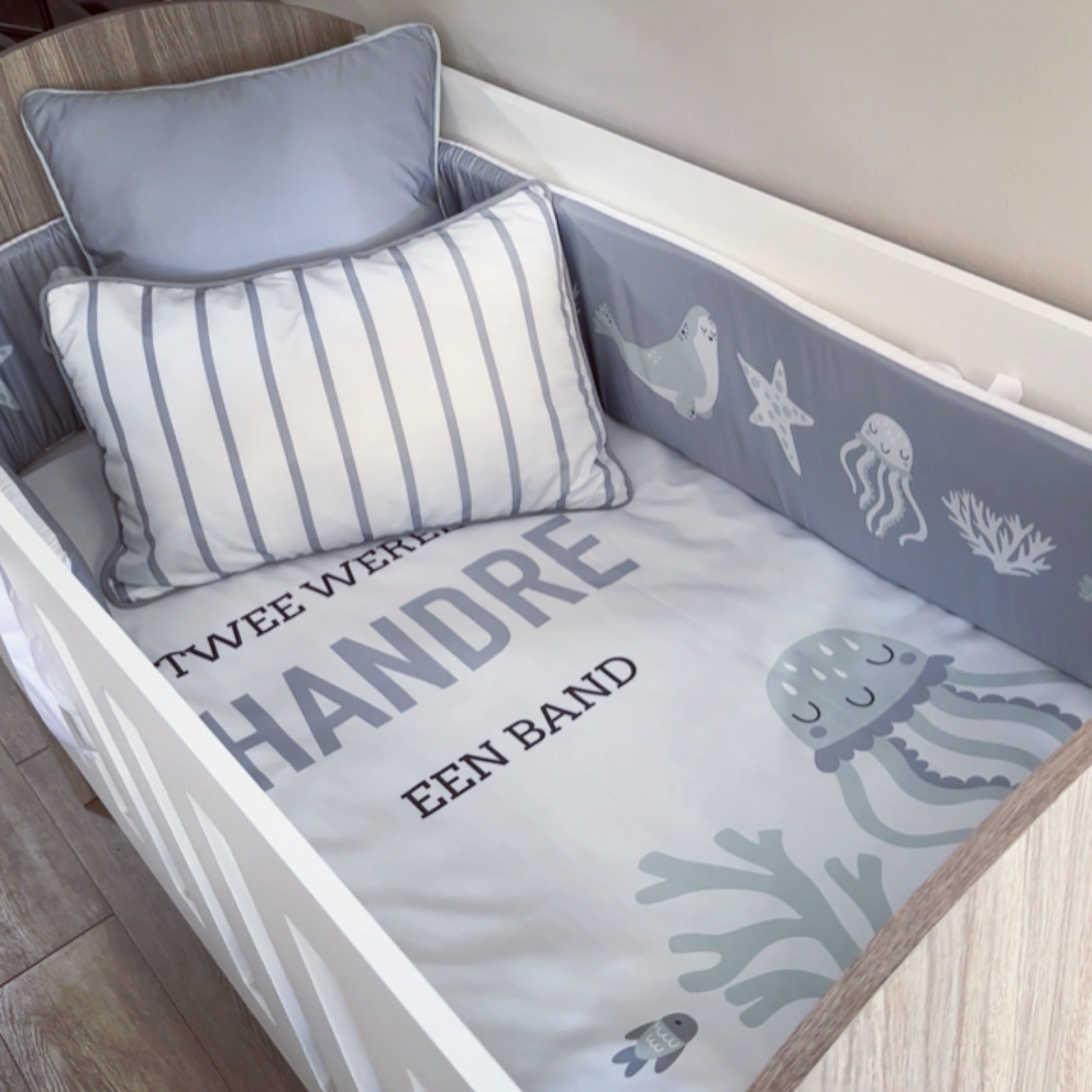 The Nursery Set: Standard Duvet Cover & Inner (80 x 110cm) | 2,5m Braided Bumper | Cot Pillow Cover & Inner | Scatter Cover & Inner | Name Pillow Cover & Inner | Change Mat Cover & Inner | Steel Frame or Wooden Frame | Set of 4 Dangles | White Fitted Sheet