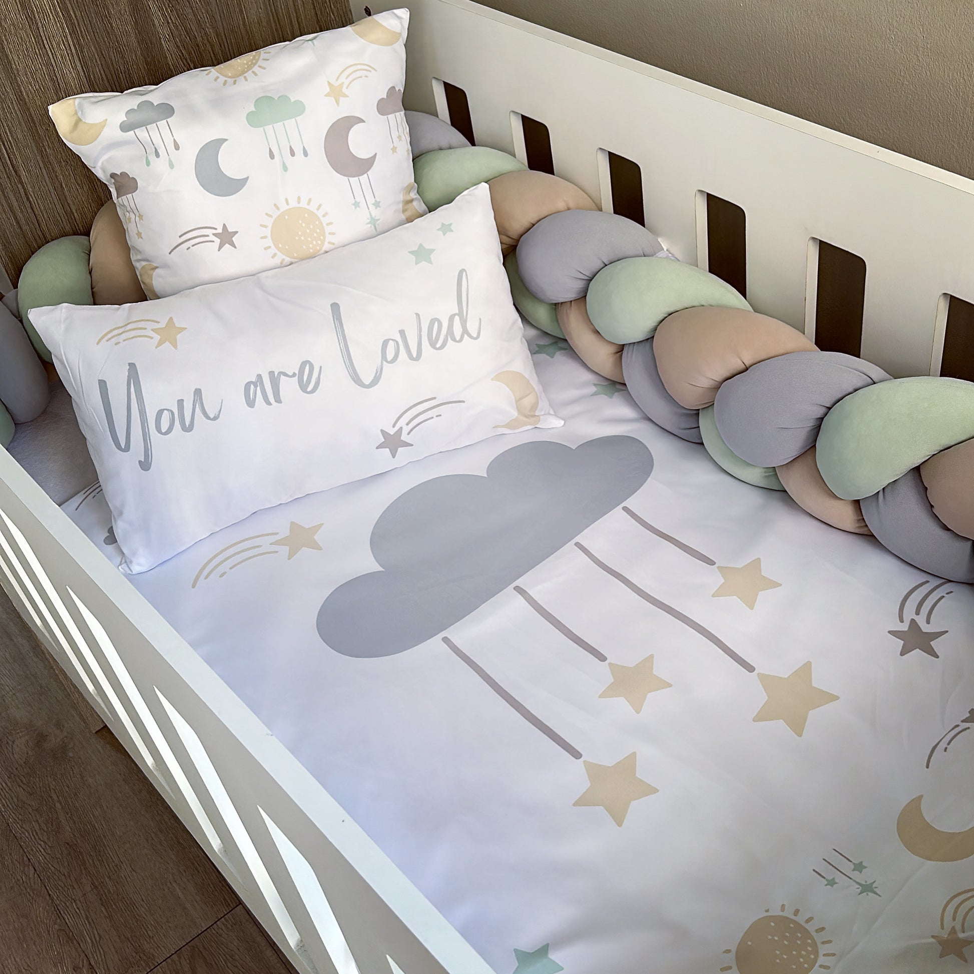 The Nursery Set: Standard Duvet Cover & Inner (80 x 110cm) | 2,5m Braided Bumper | Cot Pillow Cover & Inner | Scatter Cover & Inner | Name Pillow Cover & Inner | Change Mat Cover & Inner | Steel Frame or Wooden Frame | Set of 4 Dangles | White Fitted Sheet