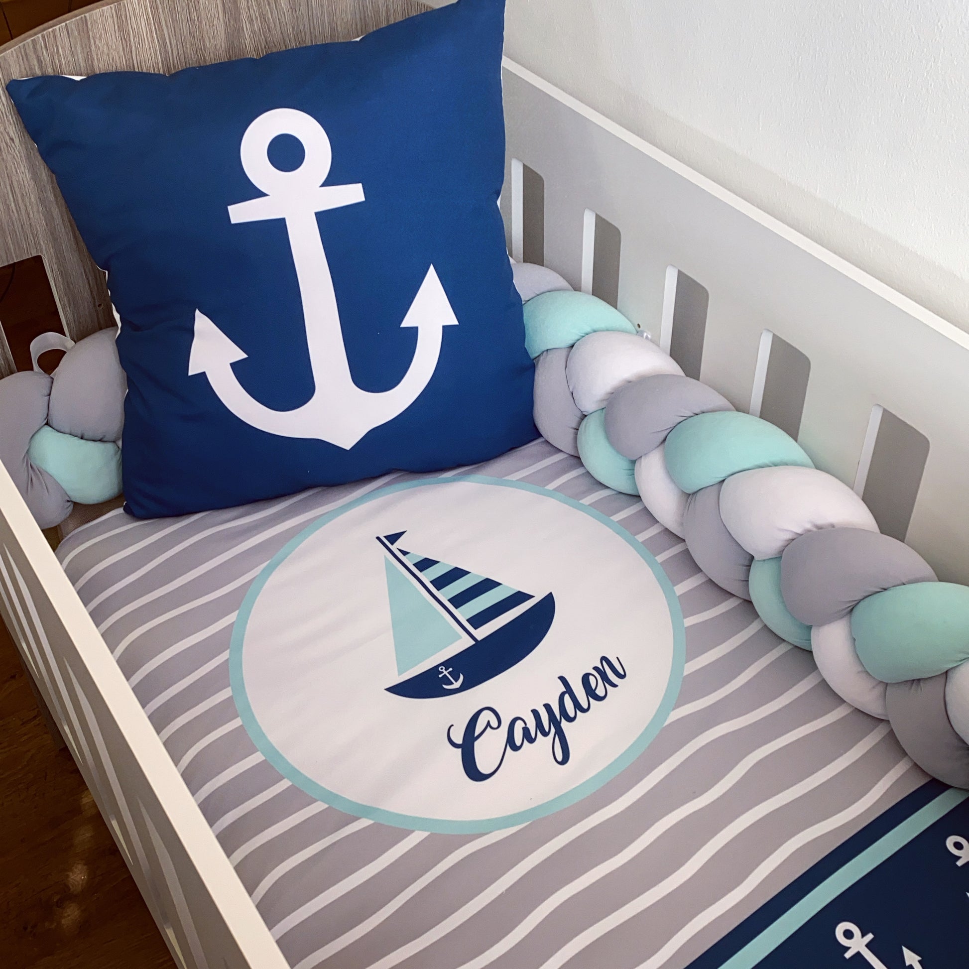 The Nursery Set: Standard Duvet Cover & Inner (80 x 110cm) | 2,5m Braided Bumper | Cot Pillow Cover & Inner | Scatter Cover & Inner | Name Pillow Cover & Inner | Change Mat Cover & Inner | Steel Frame or Wooden Frame | Set of 4 Dangles | White Fitted Sheet