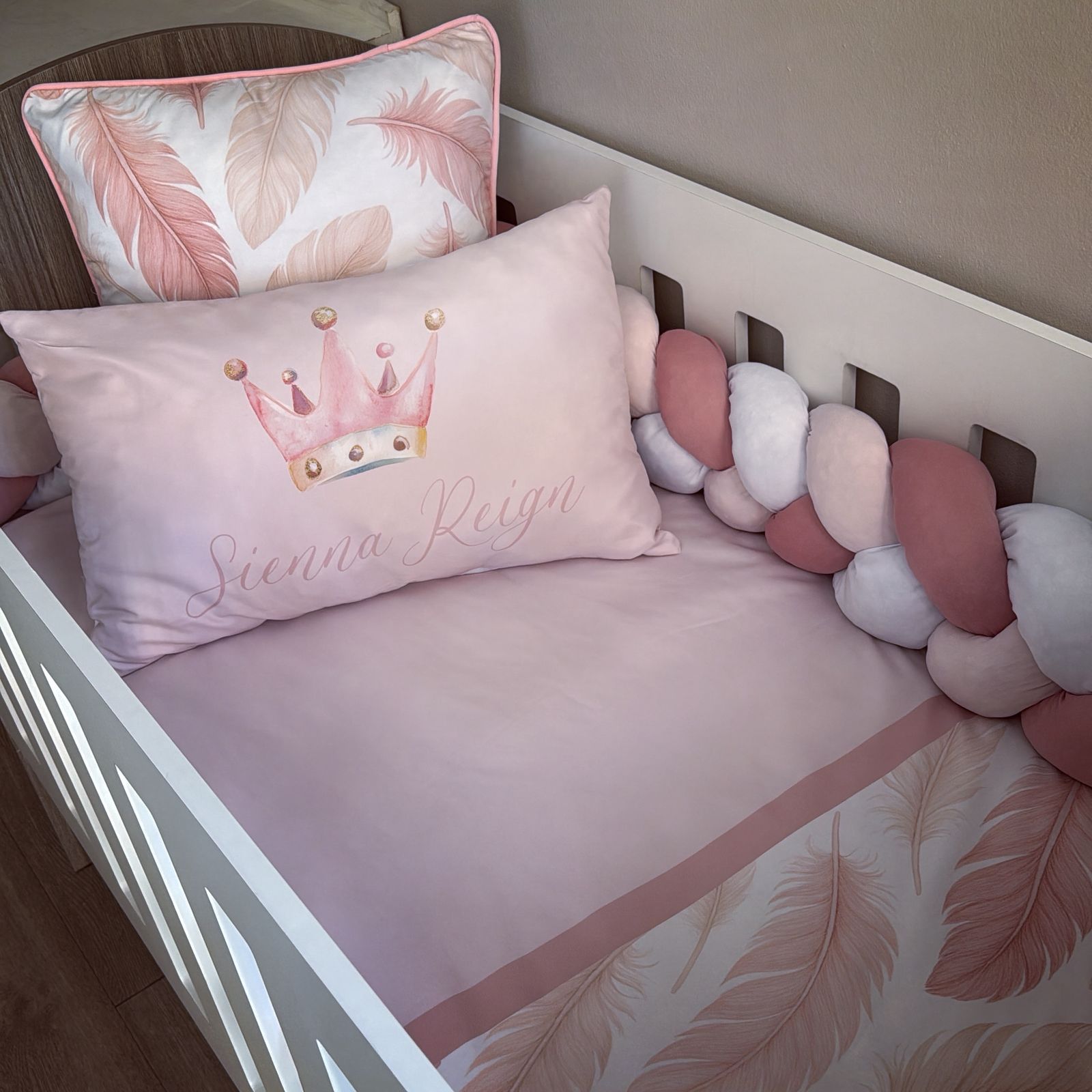 The Standard Set: Standard Duvet Cover & Inner (80 x 110cm) | 2,5m Braided Bumper | Cot Pillow Cover & Inner | Scatter Cover & Inner | Name Pillow Cover & Inner | White Fitted Sheet