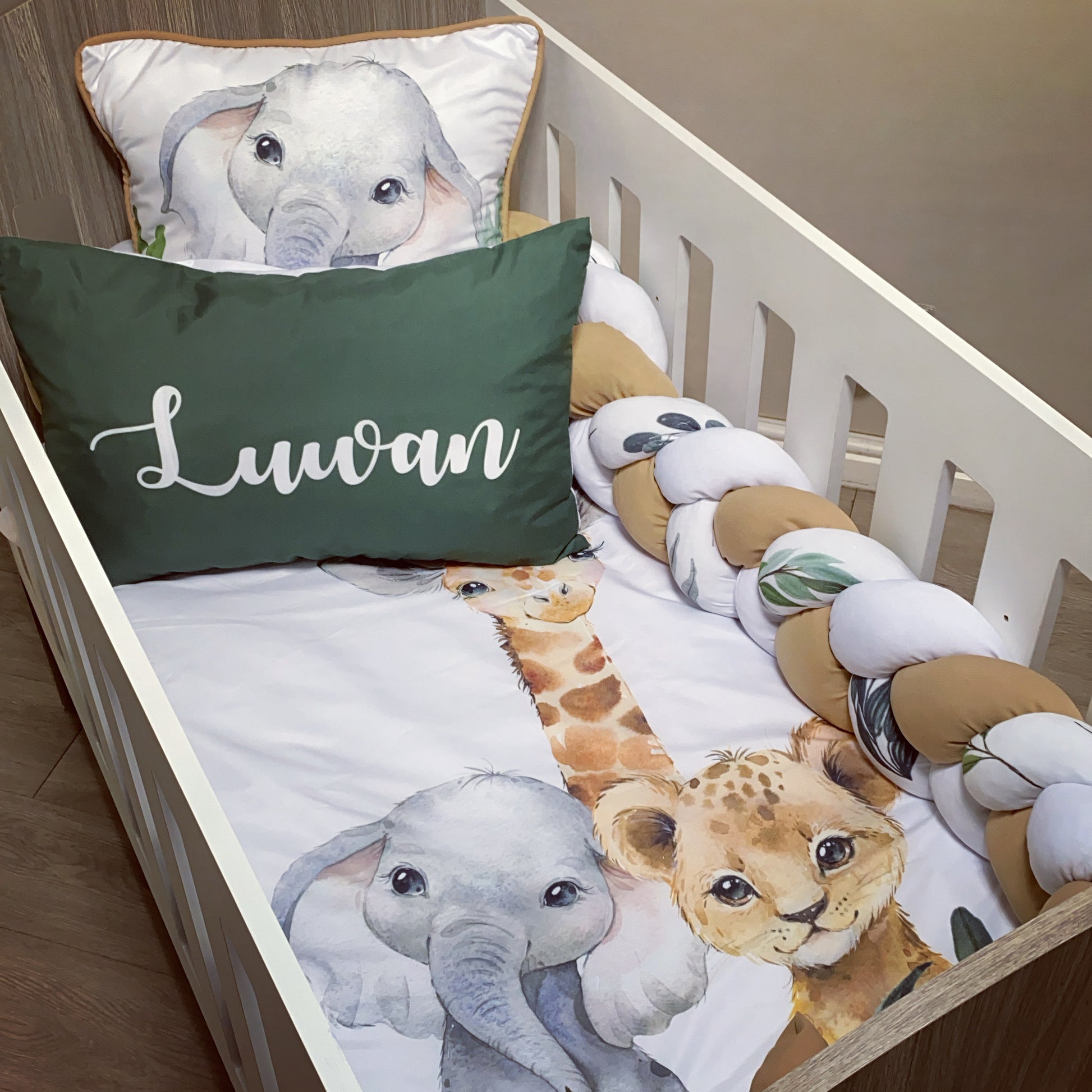The Nursery Set: Standard Duvet Cover & Inner (80 x 110cm) | 2,5m Braided Bumper | Cot Pillow Cover & Inner | Scatter Cover & Inner | Name Pillow Cover & Inner | Change Mat Cover & Inner | Steel Frame or Wooden Frame | Set of 4 Dangles | White Fitted Sheet
