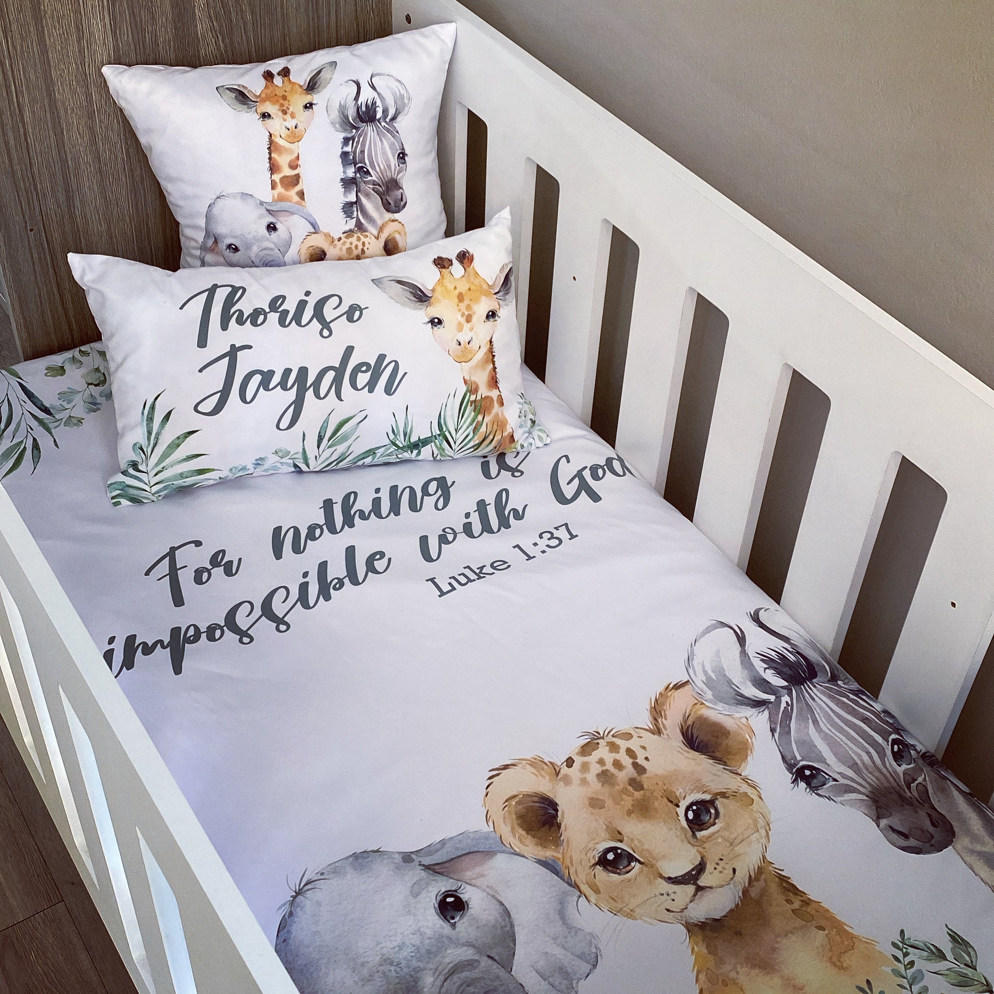The Nursery Set: Standard Duvet Cover & Inner (80 x 110cm) | 2,5m Braided Bumper | Cot Pillow Cover & Inner | Scatter Cover & Inner | Name Pillow Cover & Inner | Change Mat Cover & Inner | Steel Frame or Wooden Frame | Set of 4 Dangles | White Fitted Sheet