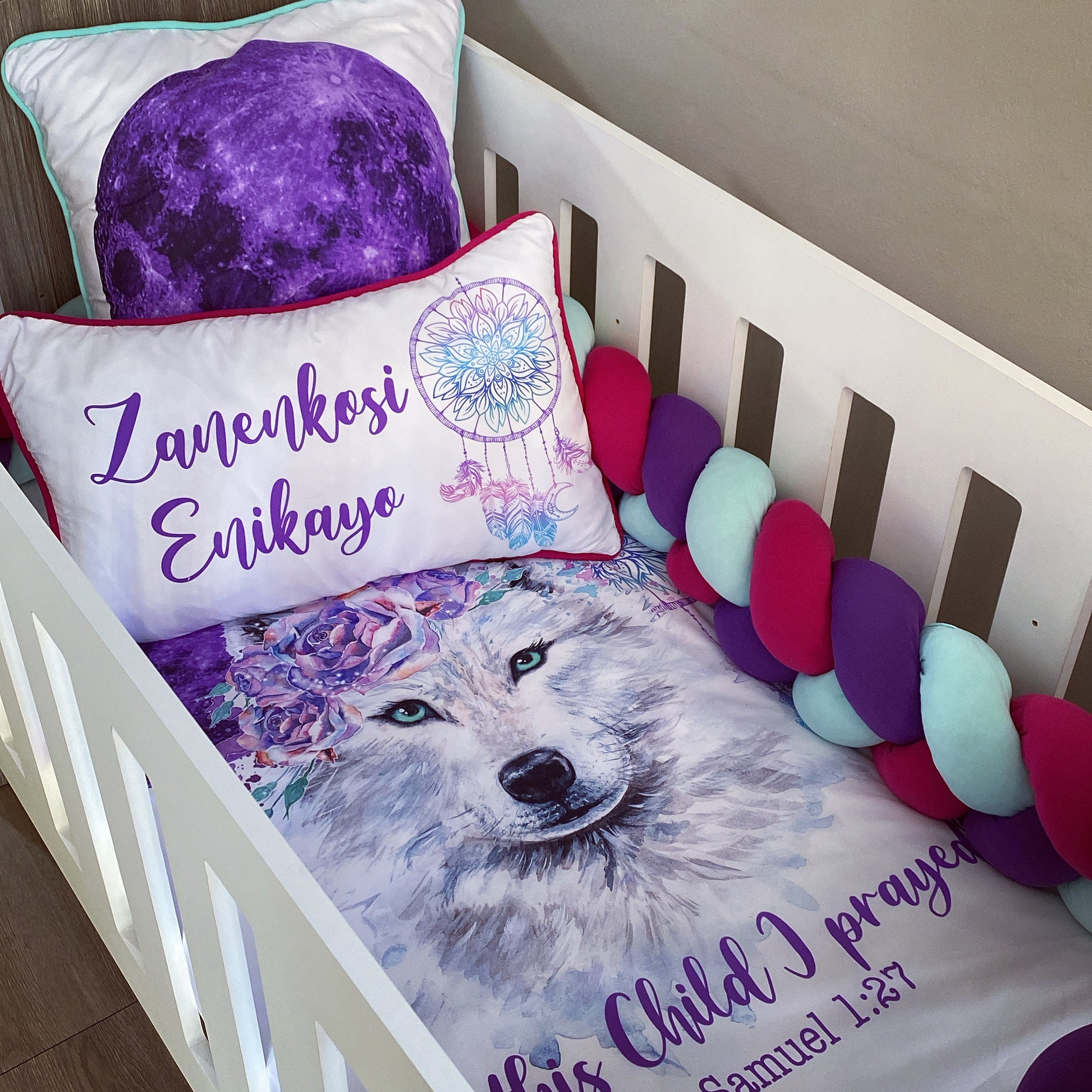 The Nursery Set: Standard Duvet Cover & Inner (80 x 110cm) | 2,5m Braided Bumper | Cot Pillow Cover & Inner | Scatter Cover & Inner | Name Pillow Cover & Inner | Change Mat Cover & Inner | Steel Frame or Wooden Frame | Set of 4 Dangles | White Fitted Sheet